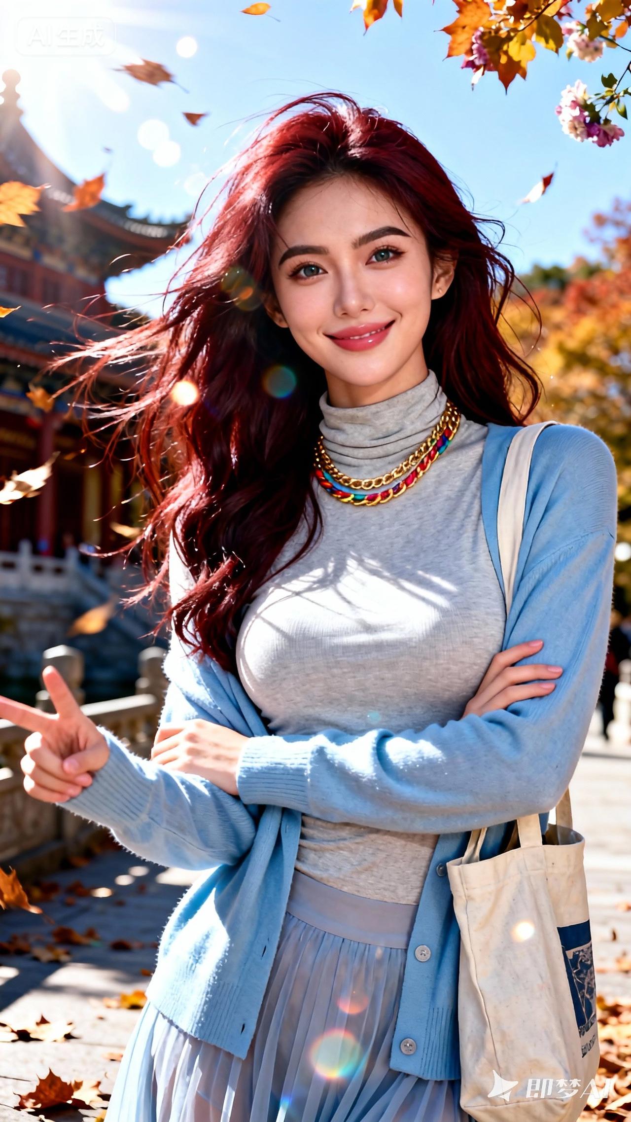 秋日暖阳下的少女,微笑如花,金项链闪耀,红发飘逸,背景古风建筑,落叶纷飞。