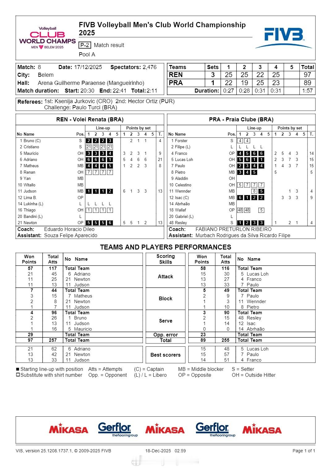 【男排世俱杯巴西德比战雷纳塔3-1海滩】国际排坛战报速递12月17日巴西贝伦,2025男排世俱杯A组巴西德比战,雷纳塔3-1(25-22/25-19/22-25/25-23)击败海滩,两队均1胜1负。阿德里亚诺21分、贾德森和纽顿各13分,卢卡斯-洛和保罗各15分、弗兰科14分。