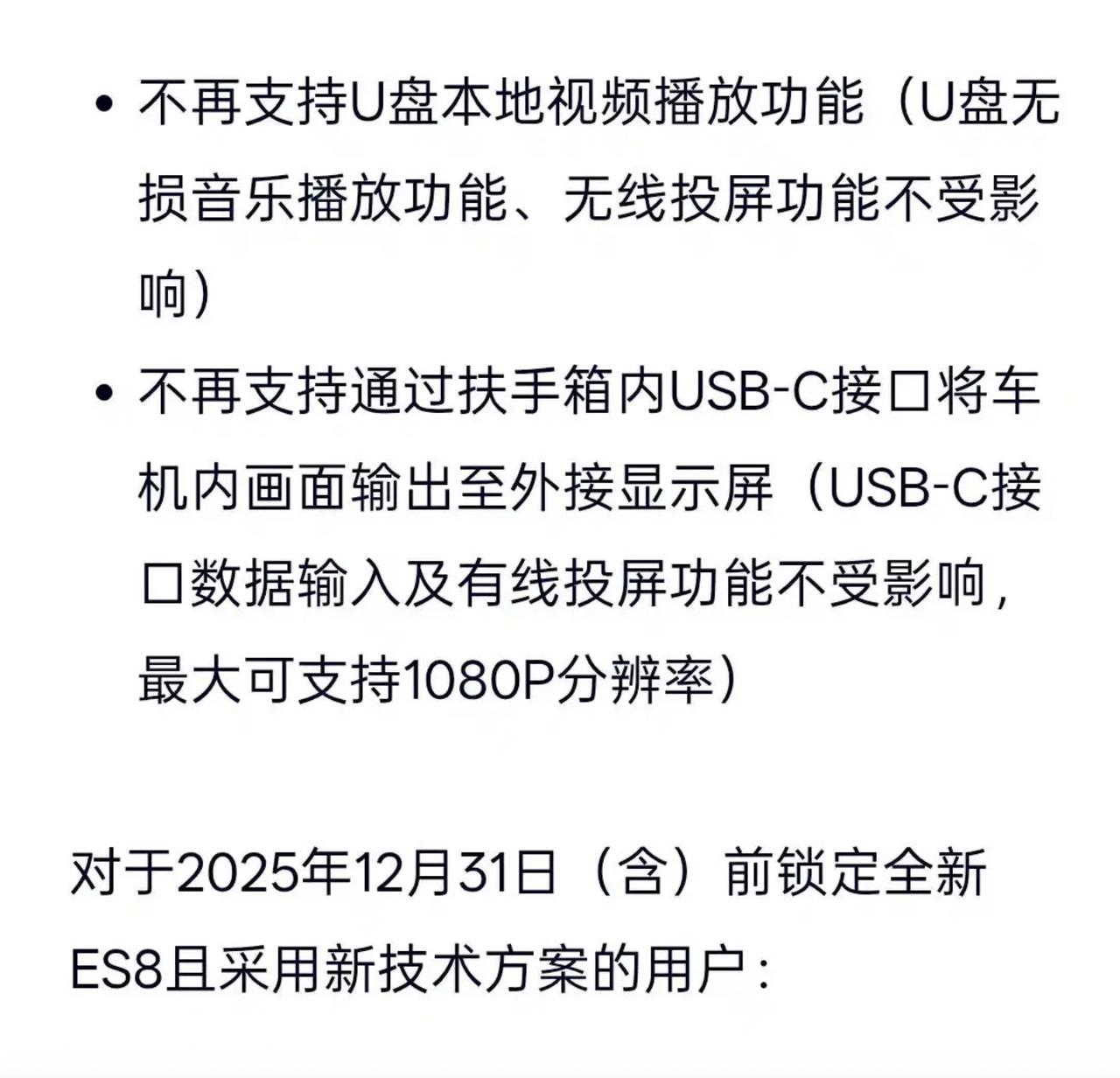 蔚来宣布因为“芯片”短缺的原因,更改未交付ES8的后排娱乐功能。 受影响的车型范围为自2025年12月22日起上线总装制造的全新 ES8,主要影响的用户体验如下:不再支持 U 盘本地视频播放功能(U 盘无损音乐播放功能、无线投屏功能不受影响);不再支持通过扶手箱内 USB-C 接口将车机内画面输出至外接显示屏(USB-C 接口数据输入及有线投屏功能不受影响,最大可支持 1080P 分辨率)。 实际上这种芯片的短缺此前也发生过,比如疫情时段,不少车型因为芯片短缺的原因,会少给车主一把钥匙,等芯片充足后再补给车主。而蔚来此次的处理是,一次性补偿15000积分,车辆交付后 3 日内发放至首任主用车人账户;在相关芯片供应改善后,若客户仍希望选择原技术方案,可支付12,000积分(或 1,200元)进行后装。