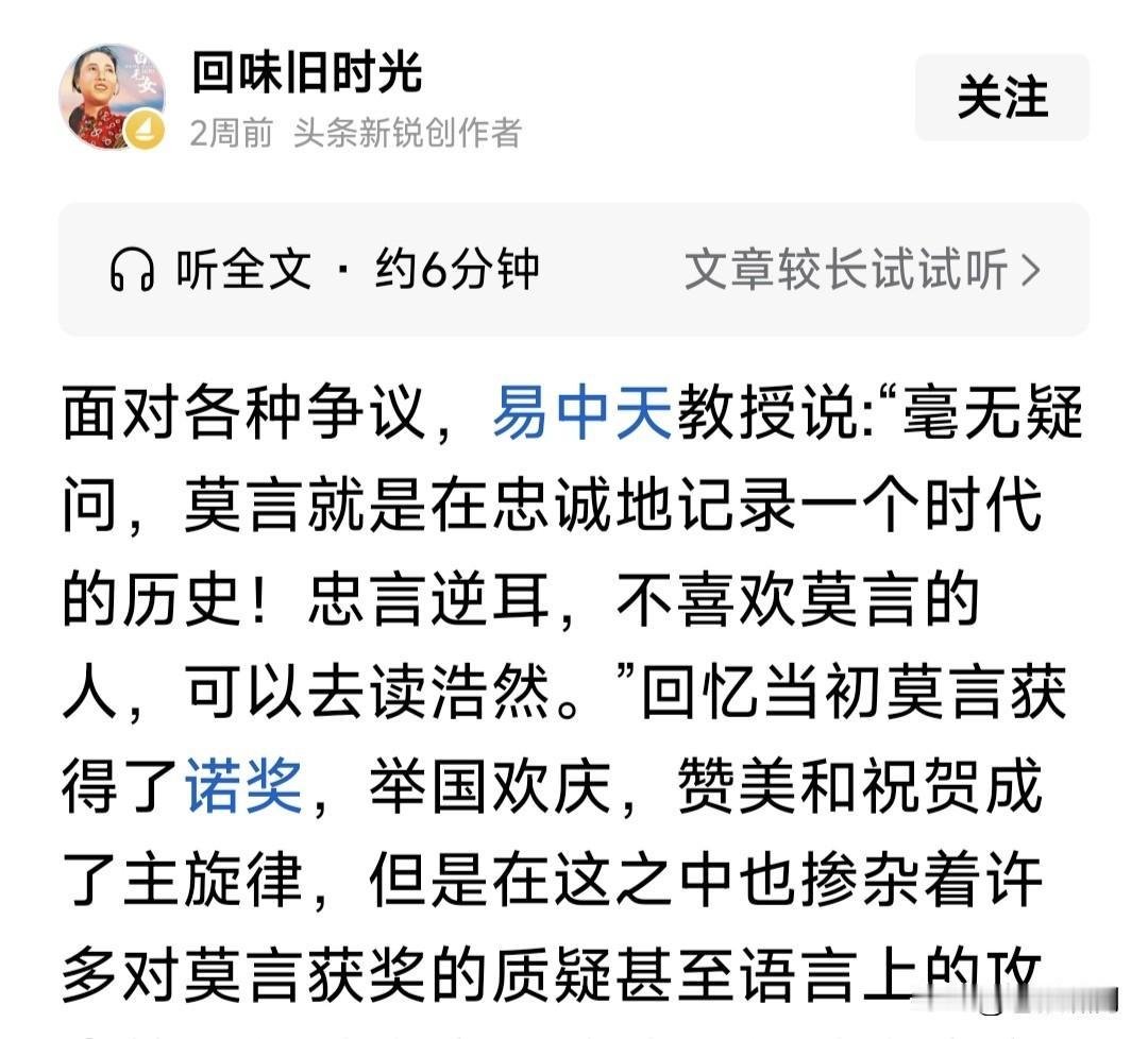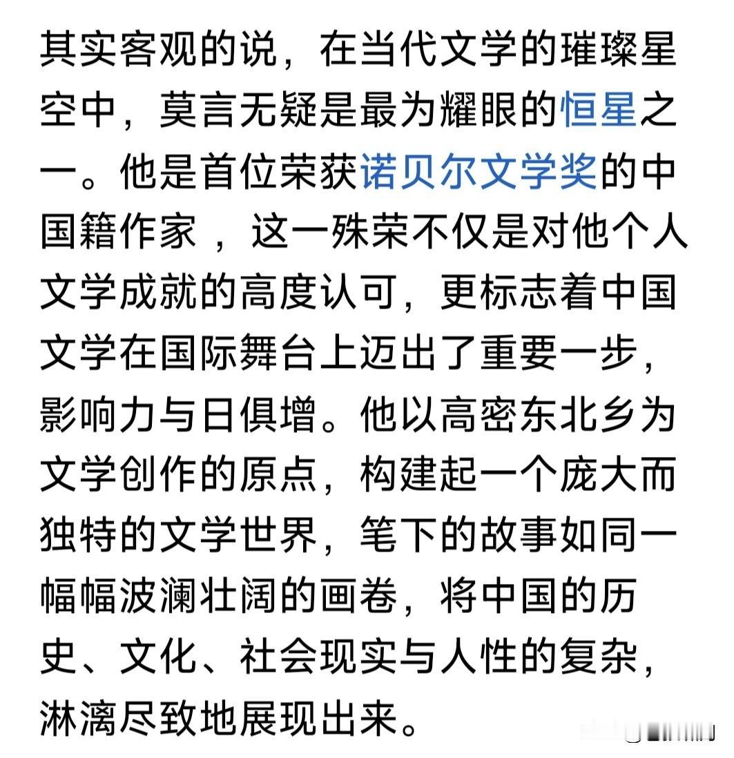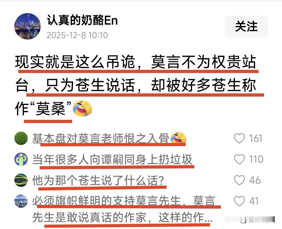 网友不解:莫言作品为苍生说话,为何有一些“苍生”称他为“莫桑”?本人看过这些评论,截取四条大家阅读。 1.莫言是敢说真话的作家,难能可贵!2.“基本盘”对莫言老师恨之入骨! 3.当年就有人朝谭嗣同身上扔垃圾! 4.他为哪个苍生说了什么话? 以上四条评论,前三条是对莫言的认可支持,以及对诋毁莫言者的批评!第四位发言者,是对莫言的否定。 莫言是当代中国文学大师,获得诺贝尔文学奖,为中国争得了世界荣誉!国家褒奖社会认可,偏有一些“苍生”不买账,称莫言“莫桑”让人哭笑不得! 苍狼不想多说什么!就用易中天教授一句话,送给这些诋毁莫言的网友:毫无疑问,莫言忠诚记录了一个时代历史。忠言逆耳,不喜欢莫言者,你可以去读浩然。但若诋毁,就是无知无畏! 比如这位网友说:莫言为哪个苍生说了什么话?请问你读过莫言的书吗?理解文学的意义吗?难道莫言为你说句话,才算为苍生吗?他记录时代历史,为社会争取到的温暖,你正在享受呢! …………