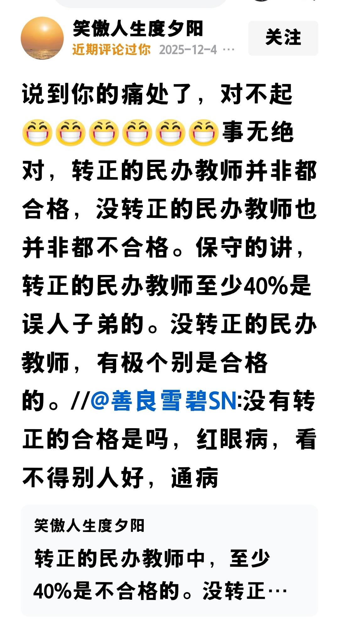 在网上,有许多网友评论过去的民办老师合格与不合格的情况,有说转正的有40%不合格,有说不转正的有许多合格的…… 民办老师合格与不合格,是由国家相关职能部门评判定论的。不是由个人自诩自嗨判断的。 81~82年国家统一整顿民办老师队伍,通过考试考核体检,合格的民办老师,评定为正式民办老师,继续教书育人。县教育局重新造花名册,填表存档,并呈报省教育厅备案,由省厅统一印制并发给《民办老师任用证》,持证上岗。以后多年民办转公办,都是从这些正式民办老师中选择录用。 而整顿后那些不合格的民办老师,一律清退离校,清除出教师队。 如今,在网上自己评判民办老师合格或不合格,都不是国家的定论的。这必须要明白的。对于这些评判,权当笑料不屑一顾罢了。