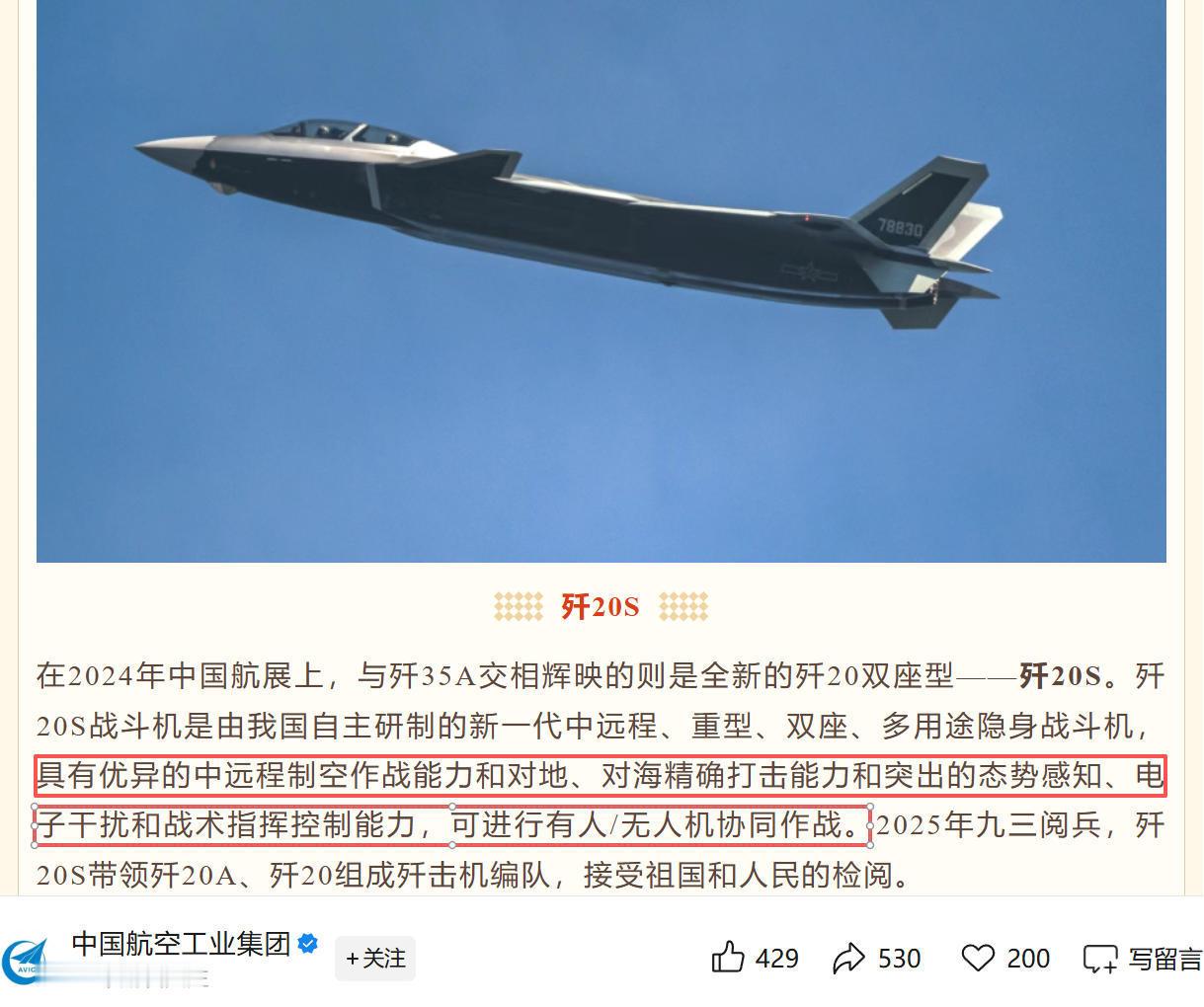 官宣了,歼-20S真不愧5.5代机,竟还具备对地、对海精确打击以及电子干扰能力!歼-20S作为歼-20战机的双座型,该战机除了具备多方猜测的制空、与无人机协同作战能力之外。“中航工业”还官宣称,歼-20S还同时具备对地、对海精确打击以及突出的态势感知、电子干扰能力,这简直就是一款全能五代机。此外,既然官宣歼-20S战机具备对地、对海精确打击能力,这也说明歼-20S所能搭载的很多新型弹药都还未公布,个人认为其中必然有可以内置的空射高超弹……烽火问鼎计划热点观点