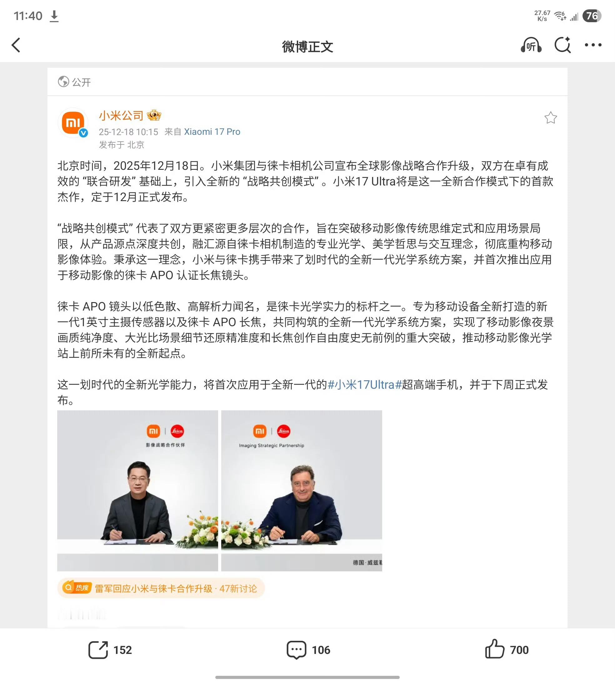 小米17Ultra发布时间定档小米17 Ultra将成为小米与徕卡全球影像战略合作升级后的首款产品,下周即将发布。将首次推出应用于移动影像领域的徕卡 APO认证长焦,实现夜景画质纯净度、大光比场景细节还原精准度和长焦创作自由度史无前例的重大突破。新一代影像机皇要来了?