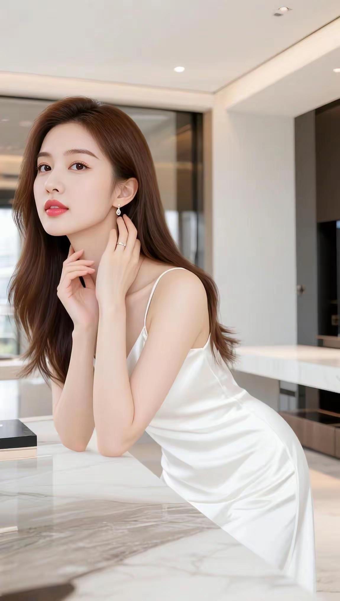 优雅白裙,精致妆容,时尚耳环,都市女性魅力