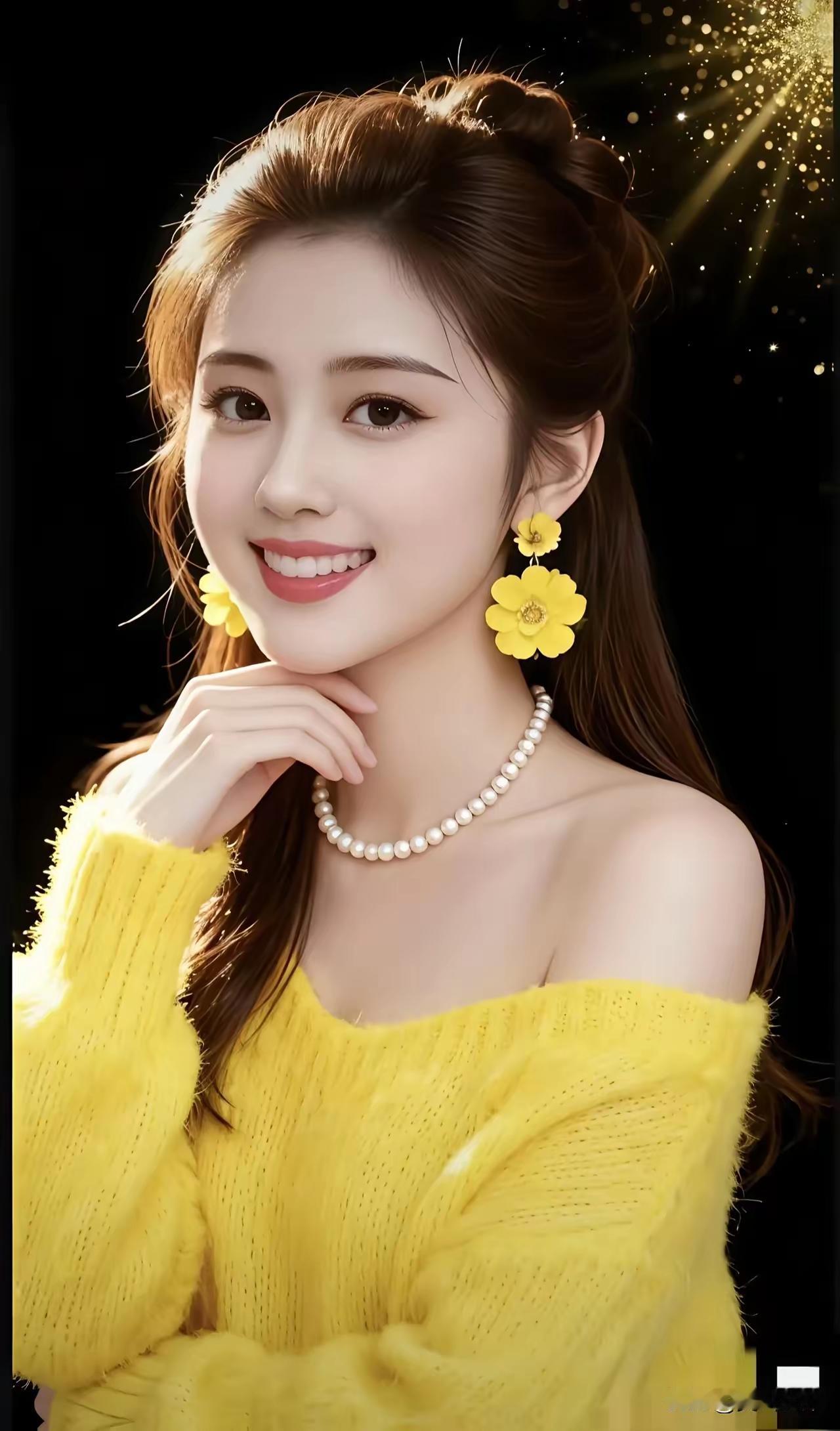 温柔甜美的黄色毛衣,搭配珍珠项链和黄色花朵耳环,散发着冬日暖阳的气息。
