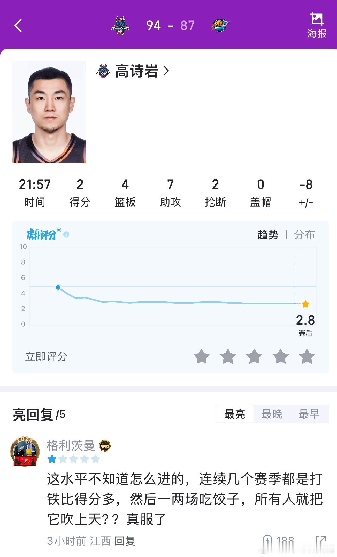 山东队这场比赛虽然在主场击败了全华班出战的四川,但主教练邱彪对于比赛的过程非常不满,赛后之言球员这样的表现对不起山东球迷,场面非难看。他表示:“年轻球员打得不错,我就找老同志,国内球员的核心。”本场比赛,高诗岩全场得到2分,场上效率值-8,四川队新秀后卫段睿骐在山东队的重点防守下仍然砍下18分。
