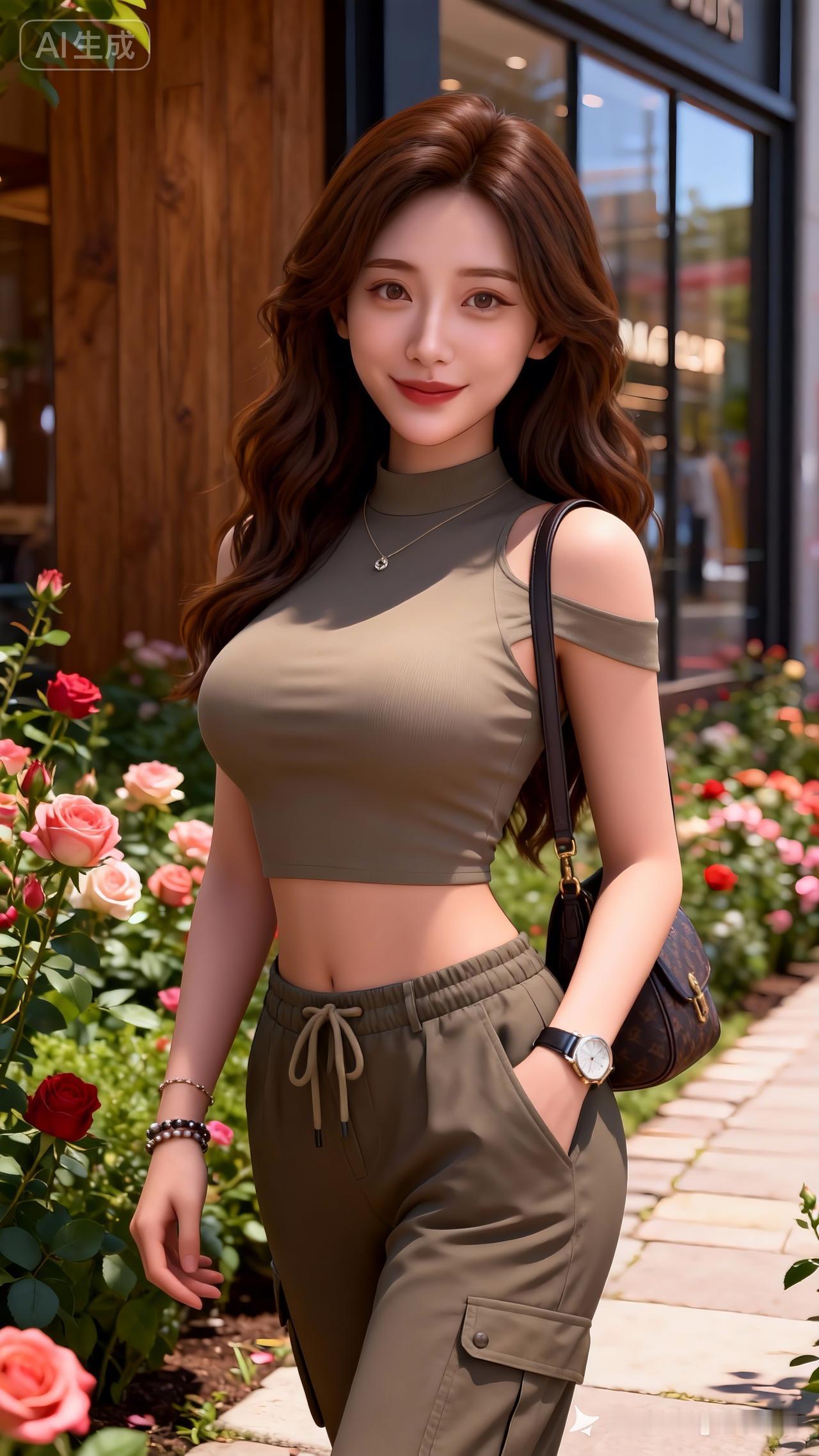 这姑娘穿着好时尚,站在花丛中。