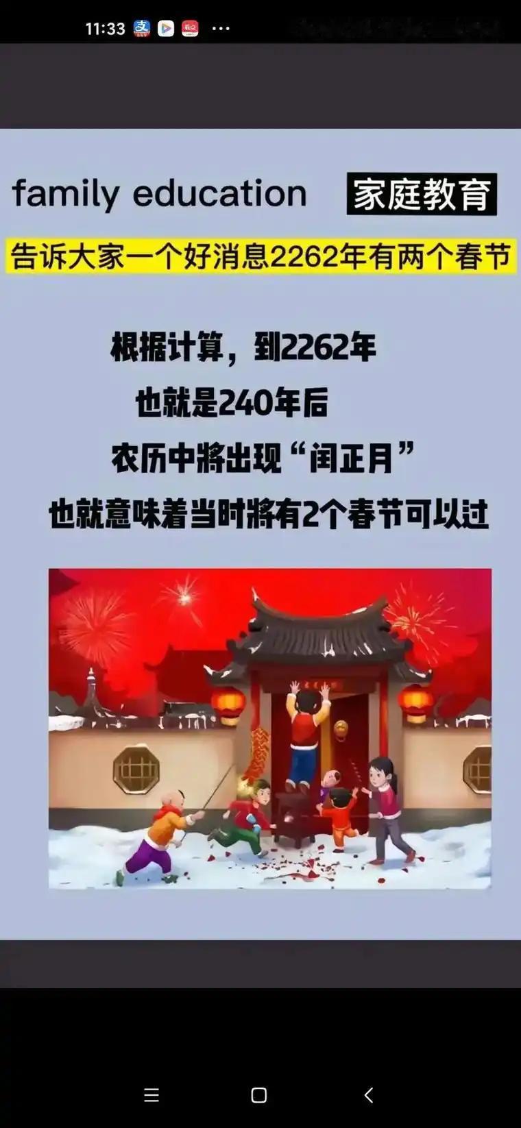 再坚持一下!2262年你将面临一个特殊的春节,因为那一年竟然会有两个! 再坚持一下!2262年你将面临一个特殊的春节,因为那一年竟然会有两个!据万年历显示,2262年1月21日是农历正月初一,2月20日则是闰正月初一。虽然闰正月初一也被称为“春节”,但传统上仅第一个正月初一被视为真正意义上的春节。这主要是因为农历与阳历存在时间差异,为了使春节保持在一年四季中的合理位置,农历采用了闰月的方式进行调整。尽管如此,公众对于是否会在2262年放假两次仍然持观望态度,毕竟这种闰正月现象极为罕见。 双春年忌讳 农历起源传说