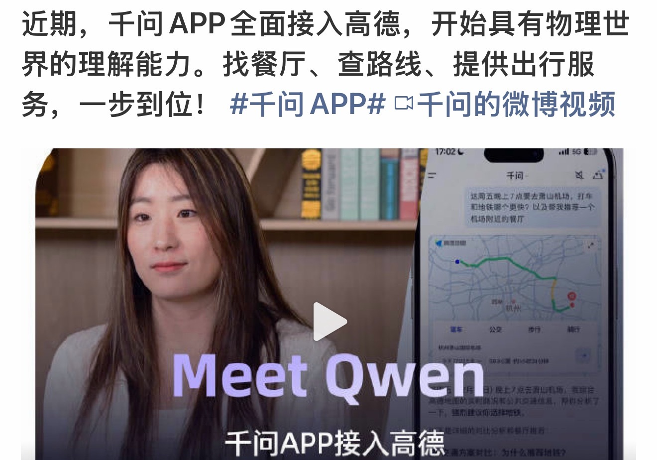 千问APP接入阿里生态场景高德接入阿里千问App千问APP今天正式接入高德了~以后再也不用再对着长篇攻略扒信息,问一句就能拿到包含餐厅、酒店、地理位置和出行方案的一站式决策卡片。这只是阿里生态联动的第一步,接下来淘宝、支付宝都要接进来……看来一个能搞定我生活大小事的服务网络,已经在路上了。