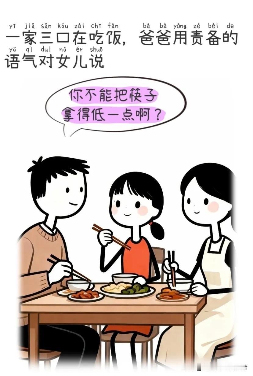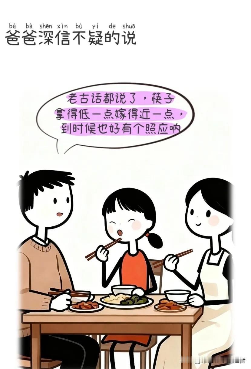 逗你笑:爸爸让女儿筷子拿得低点。妈妈:吃个饭都没安宁,你管她干嘛,她爱咋拿就咋呗,爸爸:筷子拿低一点,将来嫁近一点,妈妈:我不信搞笑漫画