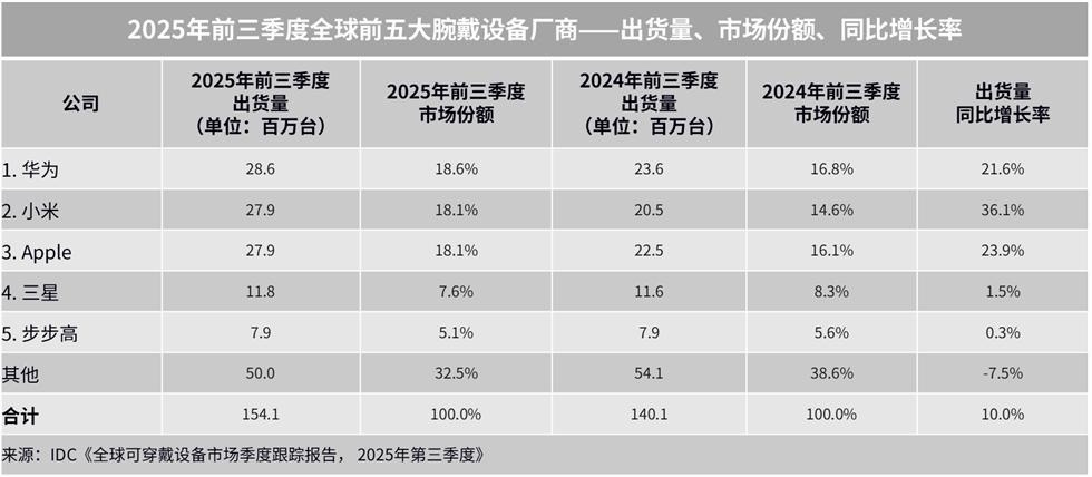 全球可穿戴设备市场季度跟踪报告,2025年前三季度全球腕戴设备市场出货1.5亿台,同比增长10.0%其中华为成为全球第一大表厂!