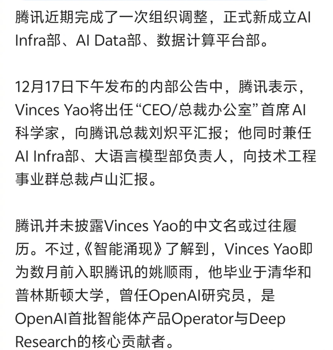 姚顺雨把腾讯的AI搞成的话,完全可以成为腾讯内部比肩张小龙的人物。看他的直接领导,差不多都是内部最核心的管理者和决策者了。