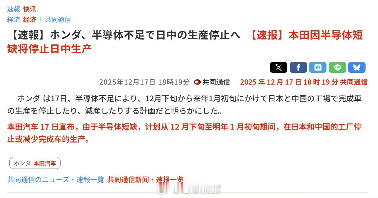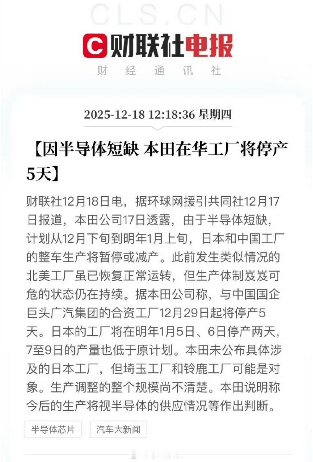 本田中国工厂将停产因半导体短缺 本田在华工厂将停产5天本田公司17日透露,由于半导体短缺,计划从12月下旬到明年1月上旬,日本和中国工厂的整车生产将暂停或减产。据本田公司称,与中国国企巨头广汽集团的合资工厂12月29日起将停产5天。日本的工厂将在明年1月5日、6日停产两天,7至9日的产量也低于原计划。本田未公布具体涉及的日本工厂,但埼玉工厂和铃鹿工厂可能是对象。生产调整的整个规模尚不清楚。本田说明称今后的生产将视半导体的供应情况等作出判断。 本田在10月和11月暂停了墨西哥工厂的生产,美国和加拿大的工厂也被迫减产,原因是全球电子元件供应商安世半导体公司(总部位于荷兰,但由中国控股)受到出口管制。不过本田未提及此次短缺的半导体是否为安世产品。 广州