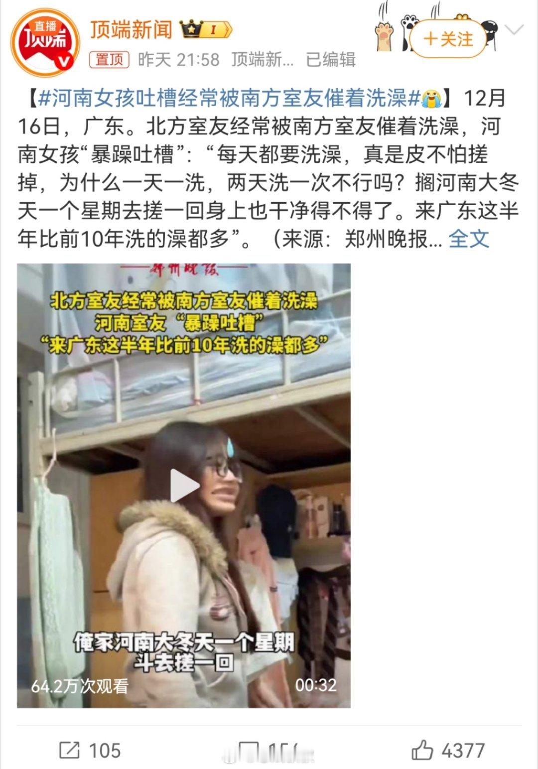 河南女孩吐槽经常被南方室友催着洗澡想起了自己以前读大学的室友,他大半夜不洗澡,几个广东人浑身难受。要知道广东人真的是天天洗澡 广州