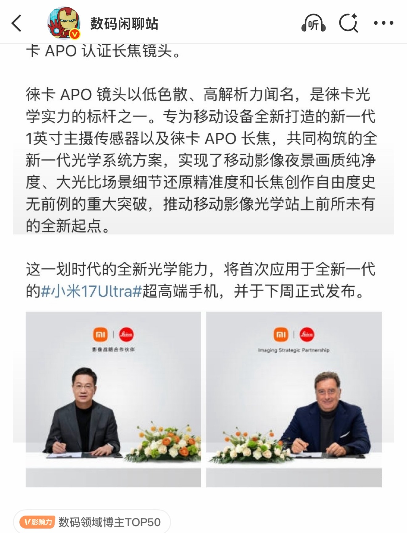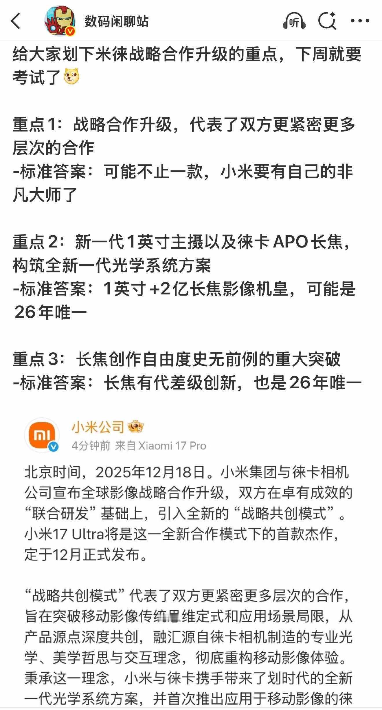 小米与徕卡合作升级 三年磨一剑的红标徕卡,这次真的来了~这不仅是合作升级,更是移动影像一次向“原汁原味”徕卡美学的深度朝圣。小米17 Ultra拥有1英寸大底+2亿长焦还不够~这次直接拿下徕卡压箱底的APO认证,移动影像里还是头一回~从结构到镀膜全方位升级,徕卡粉梦寐以求的光学巅峰居然装进手机里~在堆料如此夸张的前提下,12+256GB版本至少6999元,但我觉得这仍是一个充满诚意的答案。