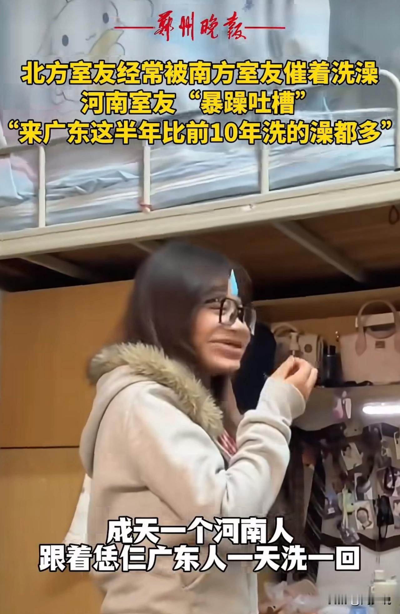 “笑哭!”河南女孩在广东上学,最近被一件事“逼疯”了!只因南方室友天天催她洗澡。女孩忍不住暴躁吐槽:“每天都要洗,皮不怕搓掉吗?两天洗一次不行吗?搁河南大冬天,一周搓一回澡都干净得很!” 据悉,来广东半年,她洗澡的次数比过去十年加起来都多!引发全网热议。 有网友说:我南方人,一天不洗睡不着,北方室友一周洗一次,我们互相嫌弃又互相包容! 也有网友表示:笑着笑着就懂了,这不是洁癖,是地域气候闹的小误会! 还有网友认为:这才是宿舍生活的真实样子,磕磕绊绊的磨合太可爱了! 在周少看来,这场 “洗澡之争” 更是一堂生动的成长教育课。不同地域的孩子同住一屋檐,学会尊重差异、包容彼此,远比争出对错更重要。 父母教会孩子讲卫生容易,教会他们换位思考、接纳不同,才是真正的情商修炼。这种在生活碰撞中学会的包容,会成为孩子未来融入社会的底气。#寻美三湘# #长沙新朋友#