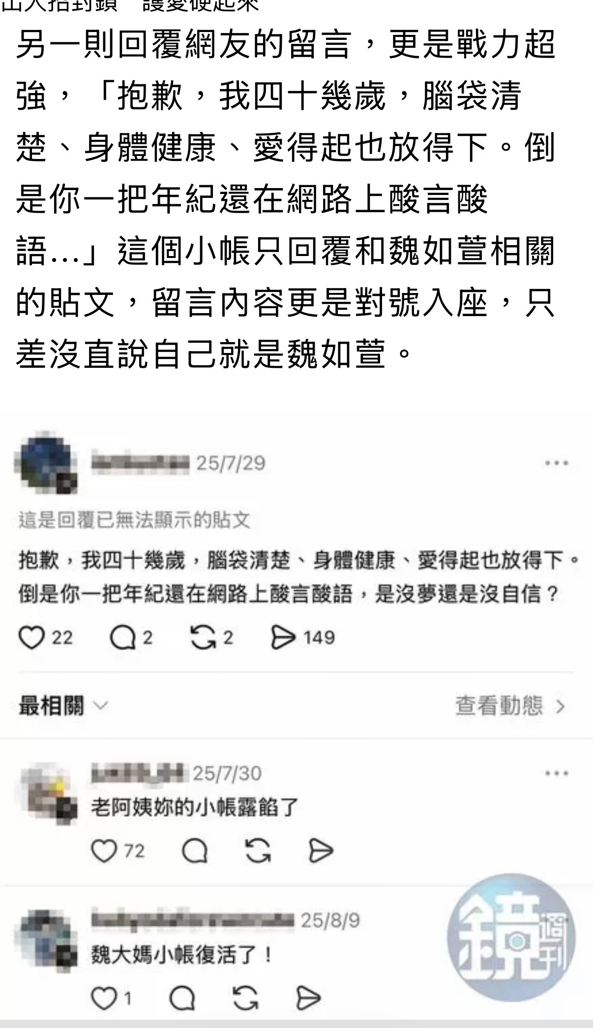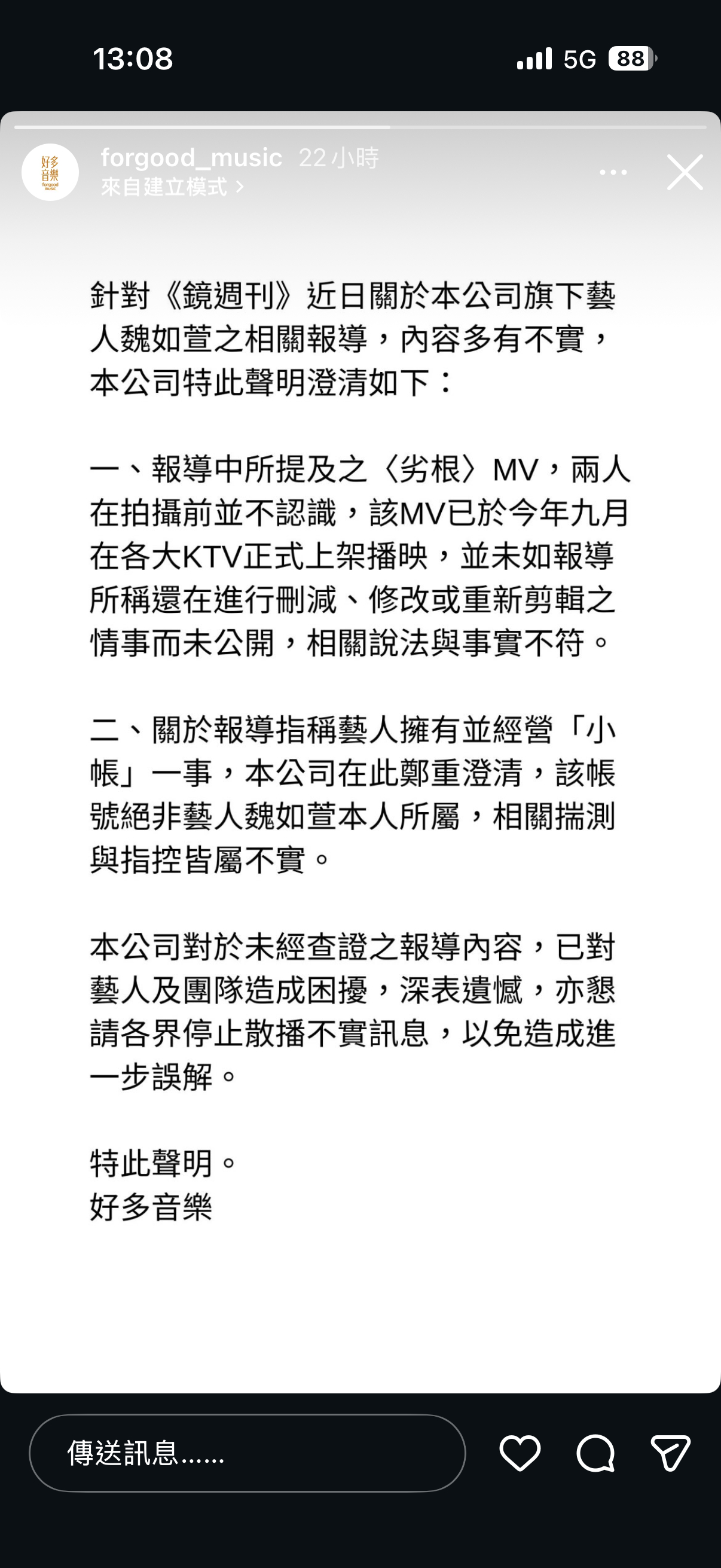 魏如萱所属「好多音乐」发声明回应台媒不实报导。镜周刊昨日报导,爆料魏如萱先前找Ian担任MV男主角,为了不让作品失焦,她把有关他的镜头全删掉;报导更指她在网路上为了护爱,不惜开小号和网友互呛。「好多音乐」对此回应:1️⃣〈劣根〉MV,两人在拍摄前并不认识,该MV早在今年9月就在KTV上架,并没有删减、修改跟重新剪辑一事。2️⃣否认小号存在一事。