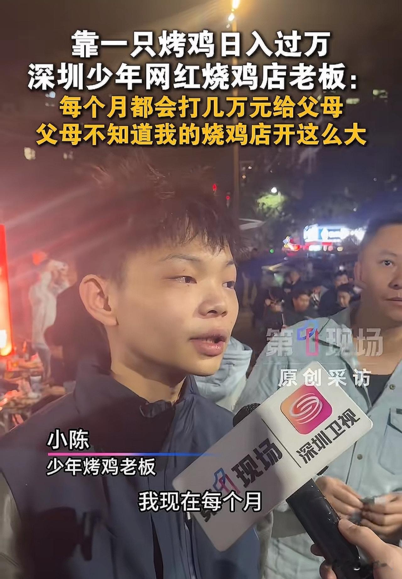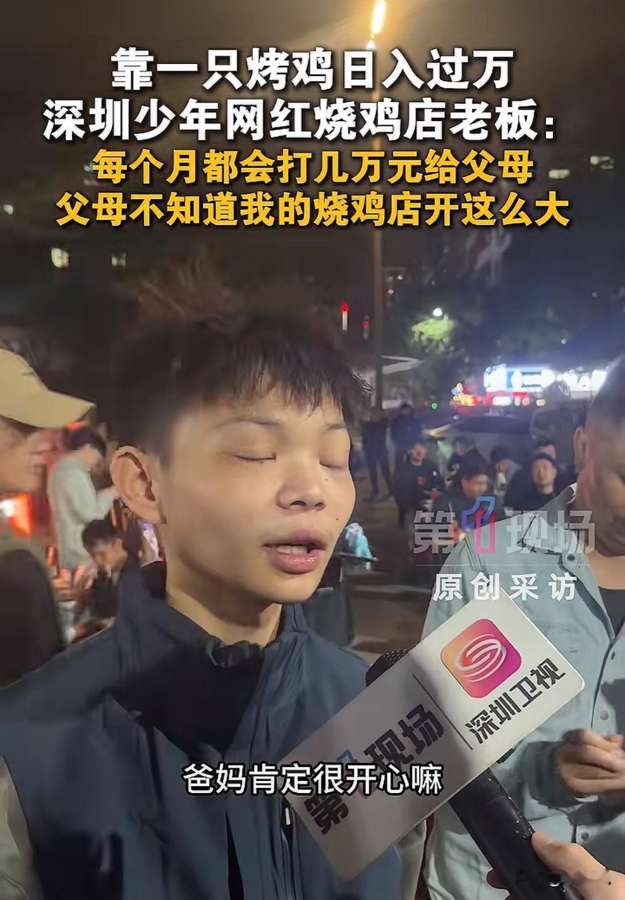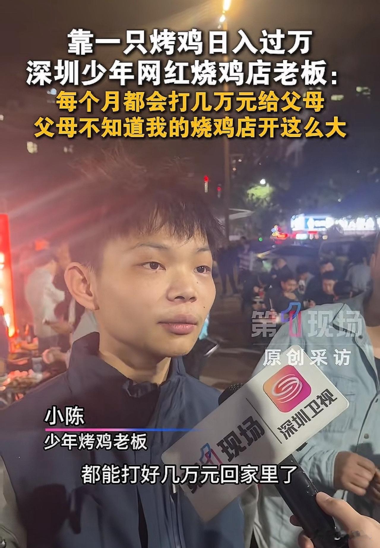 “16岁少年深圳卖烤鸡日入过万火了!”据悉,这位16岁少年是家中老七,早早就扛起了生活的担子,扎进烟火气里卖烤鸡,每天上千人光顾,日营业额轻松过万!他说:“每个月都会打几万元给父母,父母非常开心,这个年纪就是要拼,我要靠自己改变命运”! 视频曝光后,网友们纷纷点赞:“这才是年轻人该有的样子!不怕吃苦,敢想敢做,比啃老强多了!” 在周少看来,这位16岁少年的故事戳中了当下教育的一个痛点:成功从来不止一条赛道。分数固然重要,但培养孩子的责任担当、抗压能力和实干精神,同样是成长路上的必修课。 这个少年用行动证明,只要心怀目标、脚踏实地,平凡的岗位也能闯出不平凡的天地,这份敢闯敢拼的勇气,值得每个孩子学习!#寻美三湘# #长沙新朋友#