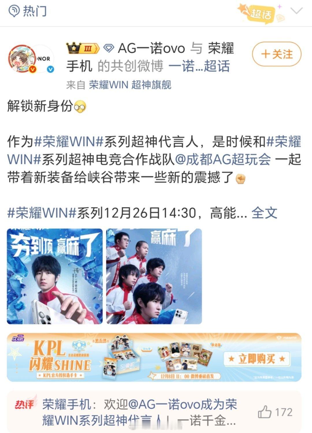 荣耀WIN官宣AG一诺合作谁懂啊!你耀还是会玩的,还是一诺生日欸而且在12月18~12月25期间,小白菜可以前往指定门店打卡生日邮筒,投递给一诺生日祝福信件~还有限量吧唧 真的是WIN 麻了啊