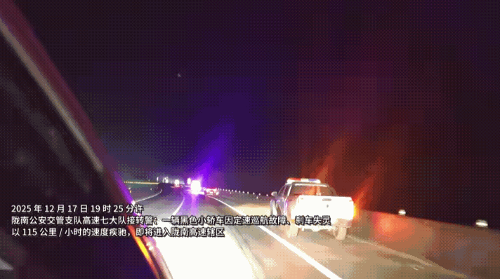 太可怕了!轿车高速上115码速度定速巡航失控刹车失灵,高速交警立体全方位协调奋战确保小车燃油耗尽安全停车。事发12月17日晚19点过,在兰海高速G75甘肃境内,一辆甘A牌照小轿车正在夺命狂奔,因为全车制动失灵。 车上一男一女两人一时间慌了神,女子赶紧拨打电话报警,警方接到报警后立刻组织当地高速交警大队全面协调指挥。警方随后派出多辆警车对失控车辆进行领航护送,确保车辆在115公里时速下畅通行驶。 同时,交警大队将小车线路发给指挥中心,协调沿途高速公路入口临时关闭,确保线路一直保持安全畅通,经过几个小时奋战,小车行驶了近500公里后,终于燃油耗尽停在一个隧道中。交警安排了拖车将事故车运送到检测点进行全面检查,同时护送两人离开高速,在多方协作下,惊心动魄的事故终于化险为夷。 小车高速上115公里时速制动失灵