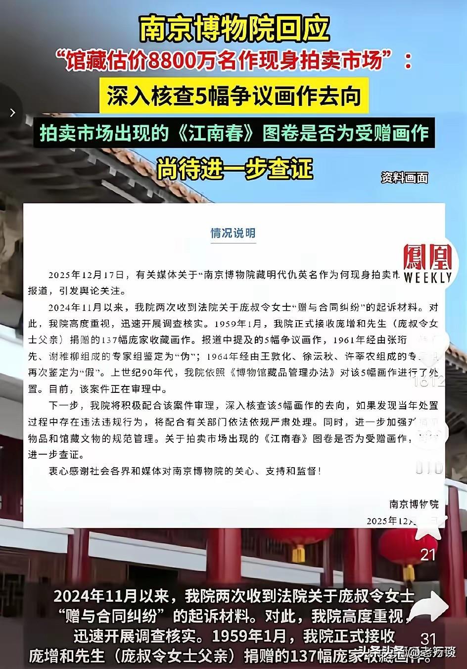 捐赠给南京博物馆藏品的庞增和的女儿质疑捐赠品怎么出现在拍卖市场。南京博物馆正式做出了回应,回应称捐赠者捐赠的名画经鉴定是伪品!在市场上拍卖的是不是博物馆流出去看看还在调查不过市场反映还是不错的,都要到过亿了,这个假品真是太真了,艺术界难道不知道这是假的吗?怎么还要去拍买呢如果捐赠者的捐赠是假的为什么不告诉捐赠者然后返还给捐赠者或者其家人呢一句假的就没下文了!这是寒了捐赠人的心。