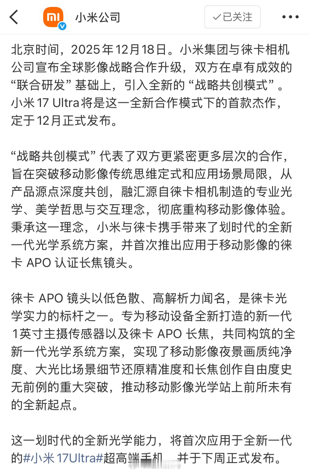 早上说过,内存涨价4倍左右 外围消息一直在说,小米17 Ultra准备提价,12+256G估摸最少要6999,如果存在红标版完全可能上万元?作为机皇增配涨价,方向没问题,毕竟配置才是王道,更何况还有徕卡镜头体系最高级别认证。至于红标,那可是之前徕卡Leitzphone的专属,17U真有红标的话那岂不是国内版leitzPhone了?小米与徕卡合作升级