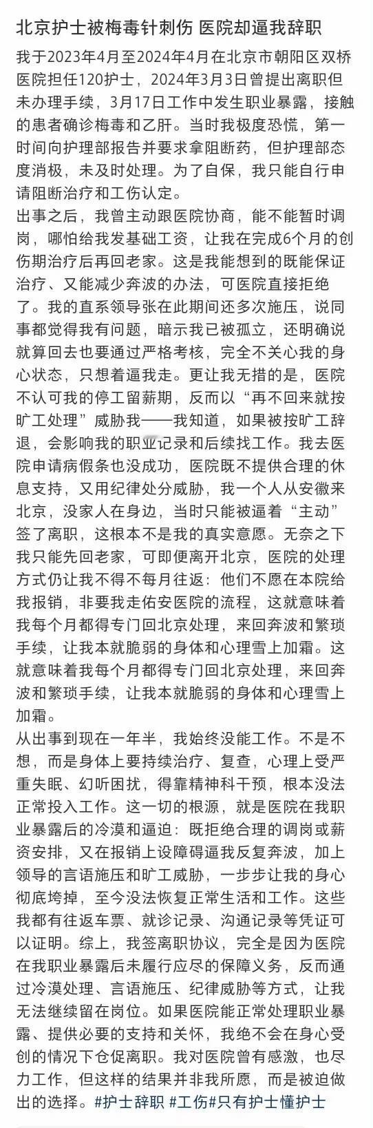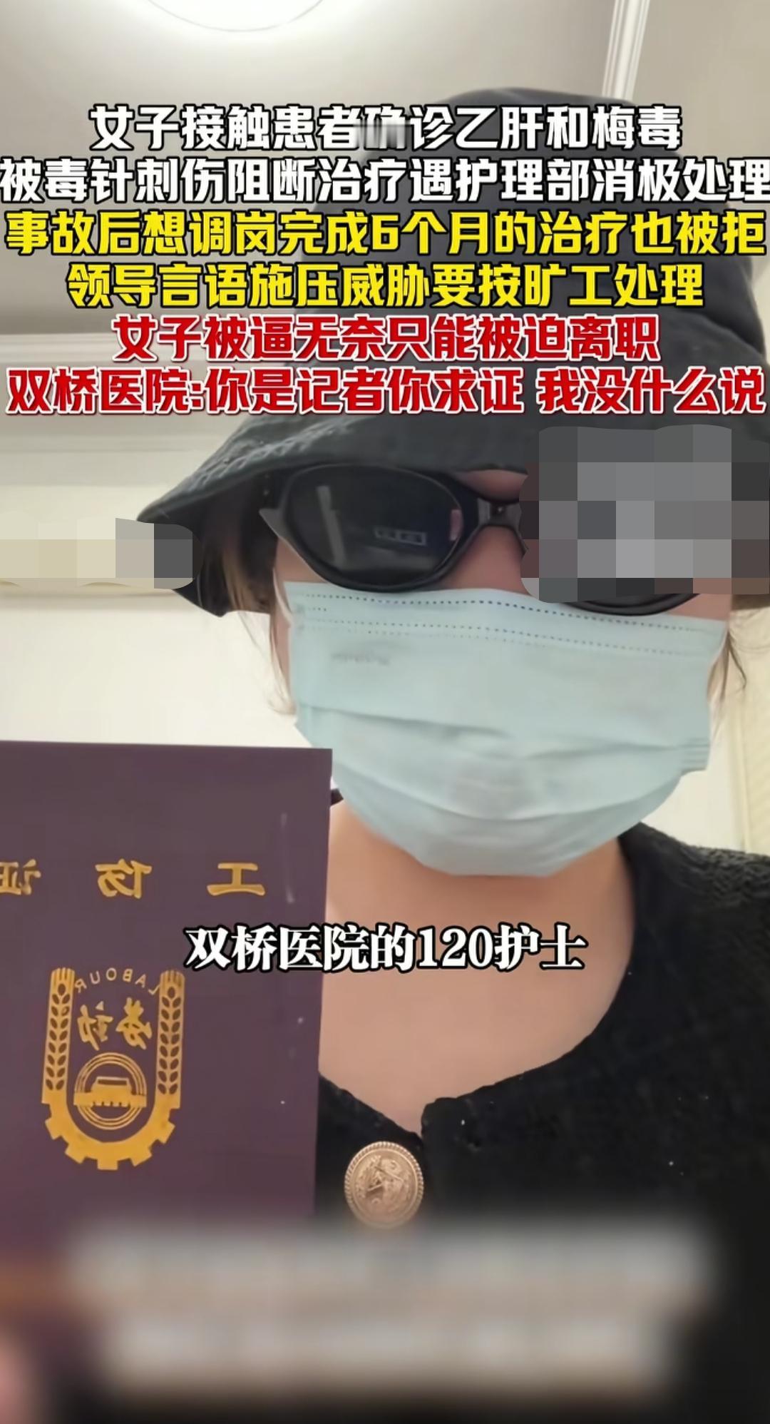 12月18日,北京。某医院女护士发视频称:自己接触患者确诊乙肝和梅毒,被毒针刺伤想第一时间接受阻断治疗遇护理部消极处理,事故后想调岗完成6个月的治疗也被拒,领导言语施压威胁要按旷工处理,女子被逼无奈只能被迫离职…… 当记者就此事求证医院的时候,医院工作人员回应:你如果是记者,你应该先去求证,而不是听一面之词! 有网友站队这名女护士: 医院还是有编制好,合同工确实容易被欺负,就这件事情上,很难不让人怀疑这就是院方在故意为难她。 不过,也有网友觉得这位女护士在爆料视频里面说的不清不楚,至少要像大家说清楚到底有没有被感染吧,可是她视频里面好像只字未提! 大家怎么看?