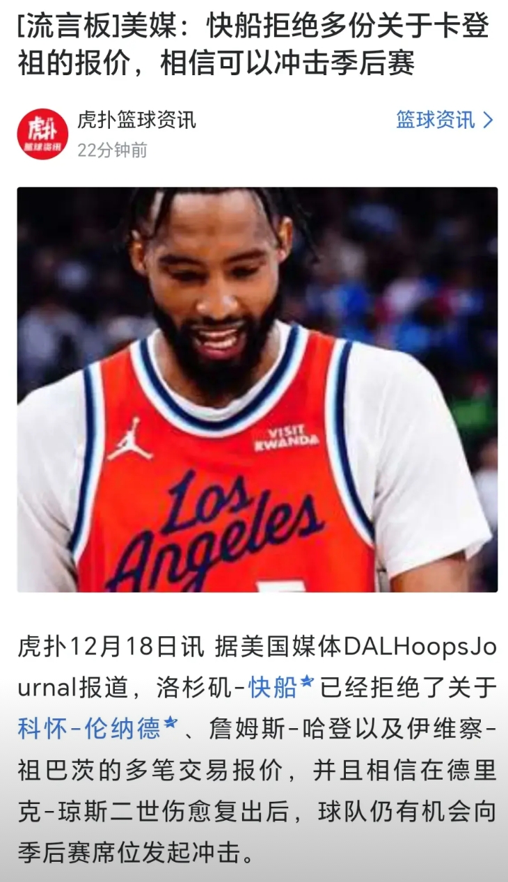 快船心真大! 快船仍然相信他们能冲击附加赛,甚至季后赛! 不是,快船也不想想,他们现在是6胜,这赛季看下西部的情况,41胜左右就可以是附加赛范围,如果要进季后赛就要45胜!那么快船最少要保持70的胜率![捂脸]说实话,就是去年的阵容才能办到,今年一点戏没有! 还是考虑一下怎么交易吧!