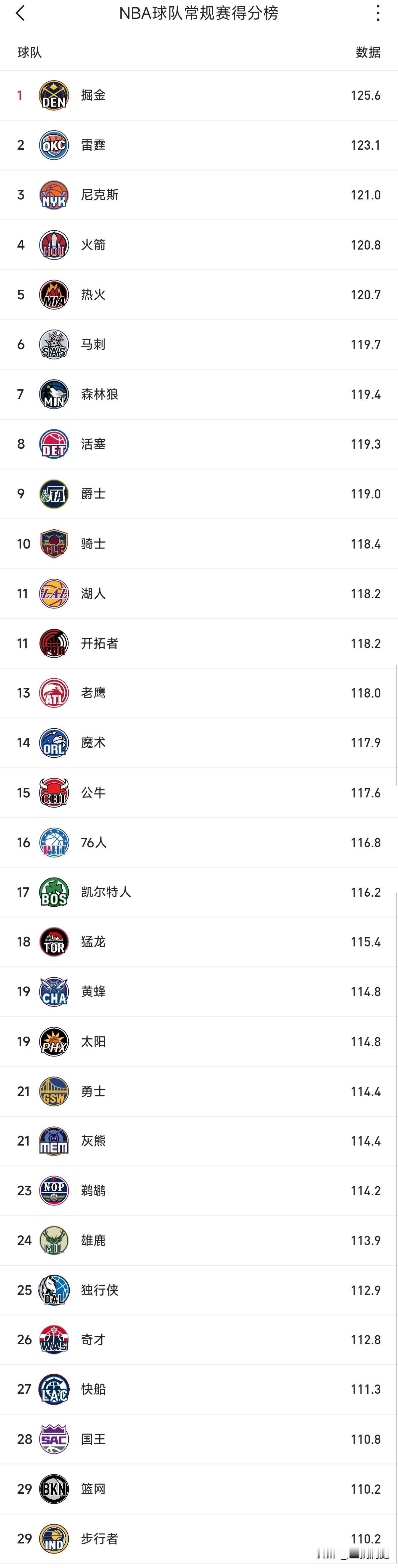 二十年时间真的能改变很多,你们还记得有个主场如果得分超过100分送汉堡吗? 本赛季场均得分最低的步行者和篮网也有110.2分,这个分数在二十年前真的不得了。目前排名第一的掘金有125.6分,总共有五支球队得分超过120分。 这也说明以后球队得分越来越高,因为命中率、罚球率和三分′比例大幅度提升。所以很多网友说詹姆斯的42000分很难打破,按目前来说真有可能。毕竟以前一个赛季2000分很难,现在达到2500分甚至更多也是可以的。