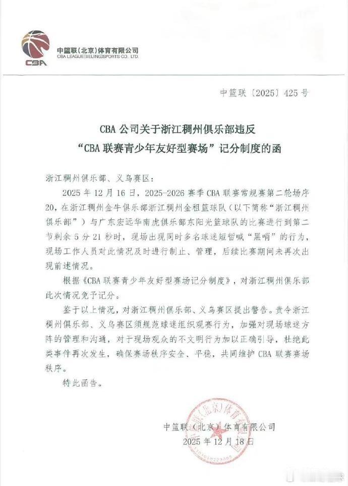浙江警方通报cba球迷赛后呼喊不当言论篮球 主场球迷高喊“黑哨”,浙江稠州俱乐部被CBA官方予以警告。北京时间12月18日,因主场对阵广东的比赛短暂出现多名球迷同时喊黑哨的行为,浙江稠州俱乐部和义乌赛区被CBA公司予以警告。公告全文如下:CBA公司关于浙江稠州俱乐部违反“CBA联赛青少年友好型赛场”记分制度的函浙江稠州俱乐部、义乌赛区:2025年12月16日,2025-2026赛季CBA联赛常规赛第二轮场序20,在浙江稠州金牛俱乐部浙江稠州金租篮球队(以下简称“浙江稠州俱乐部”)与广东宏远华南虎俱乐部东阳光篮球队的比赛进行到第二节剩余5分21秒时,现场出现同时多名球迷短暂喊“黑哨”的行为,现场工作人员对此情况及时进行制止、管理,后续比赛期间未再次出现前述情况。根据《CBA联赛青少年友好型赛场记分制度》,对浙江稠州俱乐部此次情况免予记分。鉴于以上情况,对浙江稠州俱乐部、义乌赛区提出警告。责令浙江稠州俱乐部、义乌赛区须规范球迷组织观赛行为,加强对现场球迷方阵的管理和沟通,对于现场观众的不文明行为加以正确引导,杜绝此类事件再次发生,确保赛场秩序安全、平稳,共同维护CBA联赛赛场秩序。特此函告。中篮联(北京)体育有限公司2025年12月18日