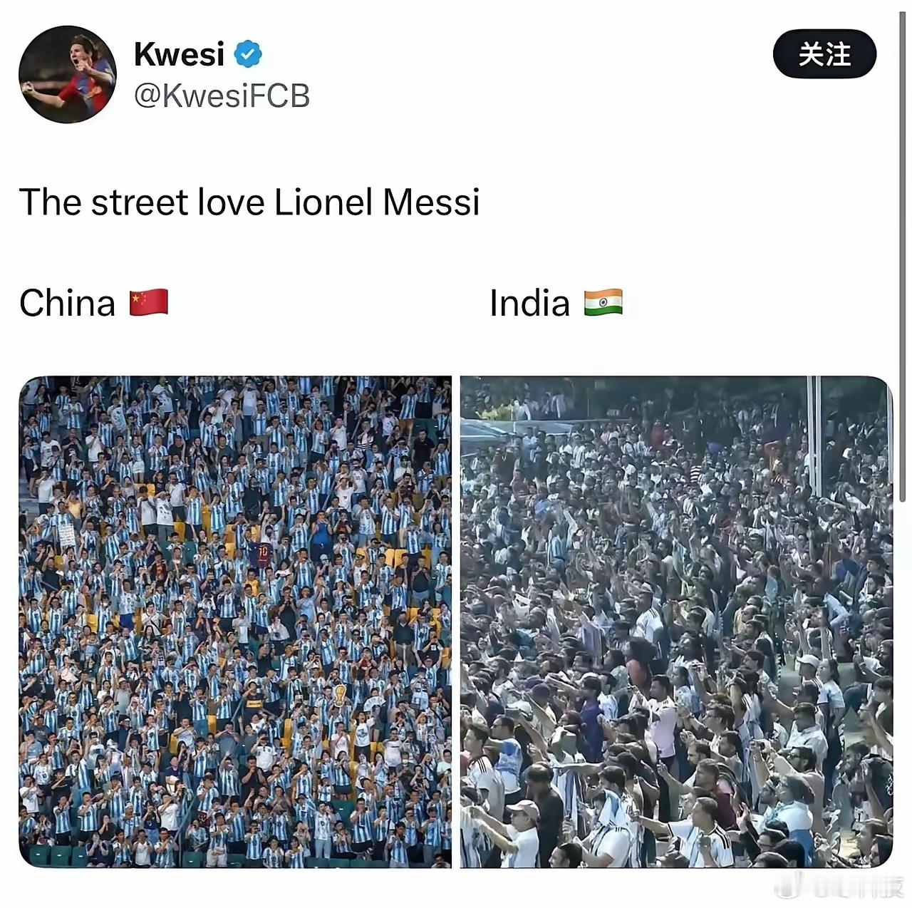 网友提问梅西访问中国和印度时,现场球迷的两张对比图,最大的区别在哪里?感觉一个是比赛,一个是见面活动。不过见识到三哥球迷和官方的利害。即没有定义足球流氓的混乱也没有定义梅西的违约,而是主办方的责任。