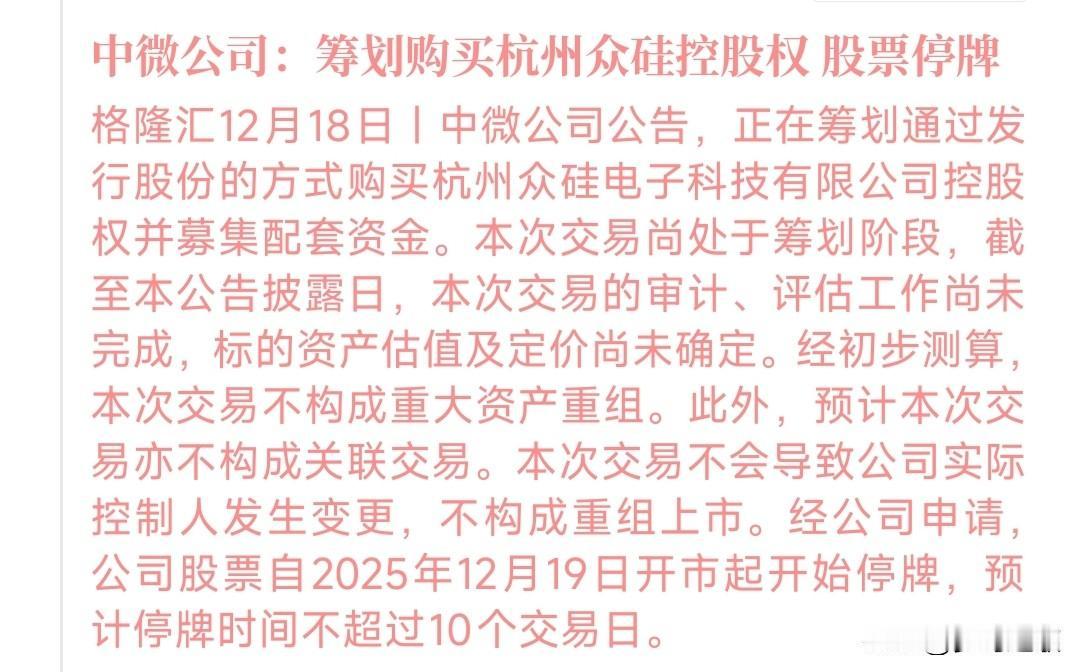 A股收盘后,半导体板块传来利好消息,龙头出现了并购 中微公司在今天收盘后发布公告,将购买杭州重硅电子的股份,公司停牌。 中微公司本来就是半导体设备领域的龙头企业,公司涉及65nm至5nm的先进制程。其氮化镓基领域处于世界领先地位。 杭州重硅电子主要是对高端半导体化学机械平坦化的研发。 中微公司显然是要拓宽自己的业务,要进入高端半导体研发领域,整个完全就是增加自己的业务量。而且中微公司完全有能力研发,其上半年投入了营收的30.7%来搞研发。