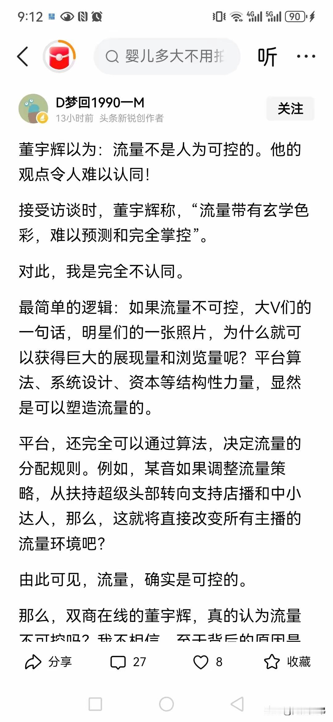 董宇辉说:他的爆红是带有玄学色彩的,是难以预测和掌控的。 又说他的伯乐是广大粉丝。 真是可笑至极啊,如果没有孙东旭你小董早就离职了,如果没有俞敏洪出资组建东方甄选,并默默的投入烧钱,你小董早就失业了。 确实你小董有今天的辉煌,是一大群粉丝支持拥护你的结果,但平台呢?如果不是平台需要,那一天哪个粉丝会刷到你,从而涌进你直播间呢? 自媒体上有能力,有文化,有情怀的主播没有百万也有上万,他们竭尽所能也只有几百甚至几十人观看。 要知道你是依托新东方和老俞的平台起来的,如果那一天之后,老俞没有利用自身资源,请一大把名人来衬托你,让你持续站在C位,你会有后面的更加爆红吗? 其实一句感谢,一声感恩很简单,但体现出来的人的基本素质是不一样的。