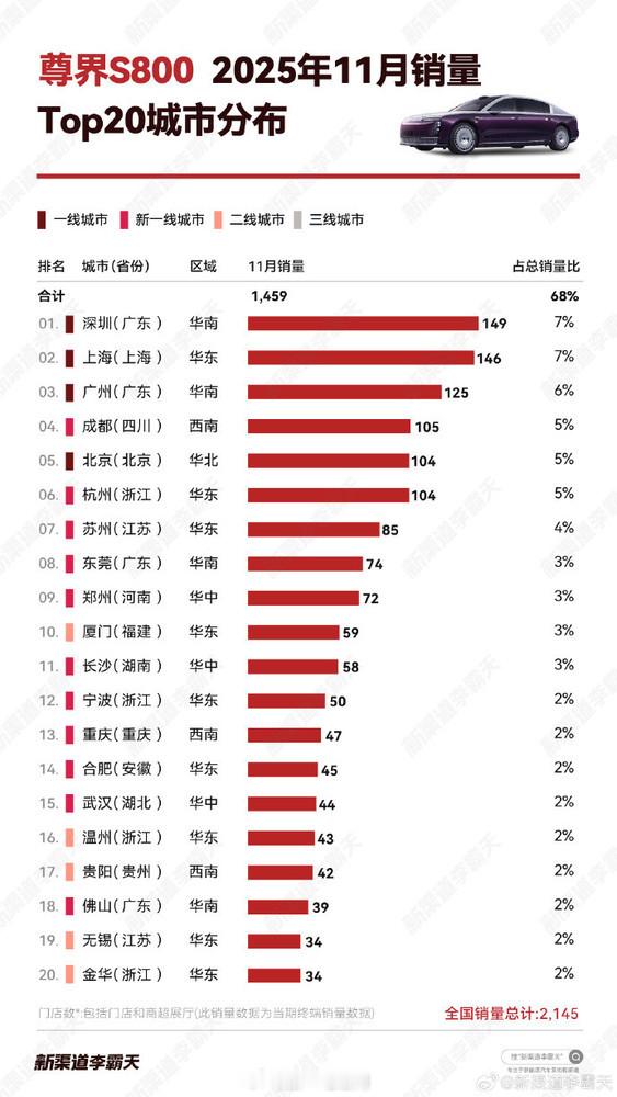 尊界S800 11月销量前五的城市北京、上海、广州、成都以及深圳里只有北京一个北方的,四个一线城市、一个新一线城市,果然还是南方大佬多