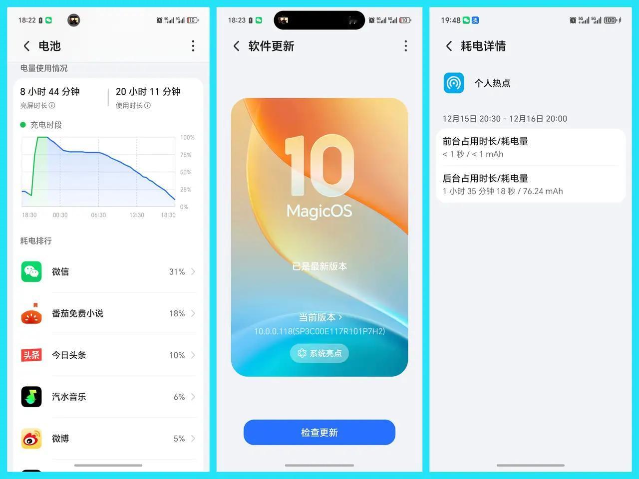 荣耀Magic8 Pro 118版本续航翻车?不存在的! 实测亮屏9小时,热点2小时还剩30%,续航依旧抗打 续航差大多是使用习惯问题,三连重度用掉电快,日常轻度用稳得很 坐等下周120版本推送!后台调度优化,续航还能再提5%,重度党狂喜,又能多肝剧多开黑啦🥳