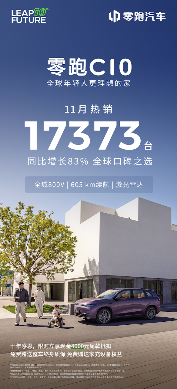 如果用一个关键词来形容 2025 年的零跑 —— 向上生长。零跑今年销量呈爆发式增长,10月、11月连续两个月销量破7万,盲猜12月又是一个新高。其中主力军正是零跑 C10 ,发挥一直相当稳定,11 月全球销量超过 17000 辆。并且在海外市场今年零跑也是开花结果,5 万的年销量目标已经完成。零跑在 11 月来自海外的订单就超过 15000 台。其中零跑C10全球累计销量突破22万辆,成为国内外市场的热销车型。C10 作为零跑首款全球车,以全球法规、全球用户需求为基础进行开发,凭借着自身产品力快速扩张到全球市场,成为零跑海外市场的核心增长点。11 月 4 日,零跑在巴西正式发布了 C10 和 B10 两款车型,开始布局南美市场,这也意味着零跑正式拿下五大洲。国内方面,C10今年1-10月累计销量稳居新势力中型SUV第一,在这个用户最挑剔的主流细分市场,能够长期保持这样的成绩,消费者已经用自己的钱包投票了。回头想一想,面对十四万级的家用 SUV 市场,C10 确实吸引力极强。有增程版车型,可油可电。纯电车型搭载 800V 架构,在这个价位区间的产品中并不多见,有效解决了补能问题。除此之外,空间和智能化表现都相当不错,在同价位里几乎没有对手。今年的零跑已经「文体两开花」,明年整个品牌冲刺百万目标非常有希望,估计 C10 也会贡献不少的成绩。胡杏儿成为香港首位零跑车主 零跑C10