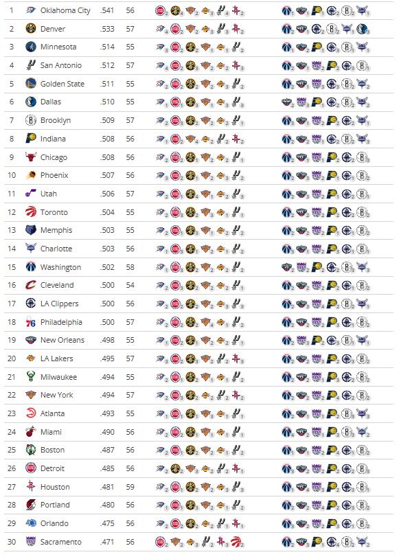 NBA30支球队,剩余赛程难度排名-20251218 【1】俄克拉荷马城·雷霆 【2】丹佛·掘金 【3】明尼苏达·森林狼 【4】圣安东尼奥·马刺 【5】金州·勇士 【6】达拉斯·独行侠 【7】布鲁克林·篮网 【8】印第安纳·步行者 【9】芝加哥·公牛 【10】菲尼克斯·太阳 【11】犹他·爵士 【12】多伦多·猛龙 【13】孟菲斯·灰熊 【14】夏洛特·黄蜂 【15】华盛顿·奇才 【16】克利夫兰·骑士 【17】洛杉矶·快船 【18】费城·76人 【19】新奥尔良·鹈鹕 【20】洛杉矶·湖人 【21】密尔沃基·雄鹿 【22】纽约·尼克斯 【23】亚特兰大·老鹰 【24】迈阿密·热火 【25】波士顿·凯尔特人 【26】底特律·活塞 【27】休斯顿·火箭 【28】波特兰·开拓者 【29】奥兰多·魔术 【30】萨克拉门托·国王