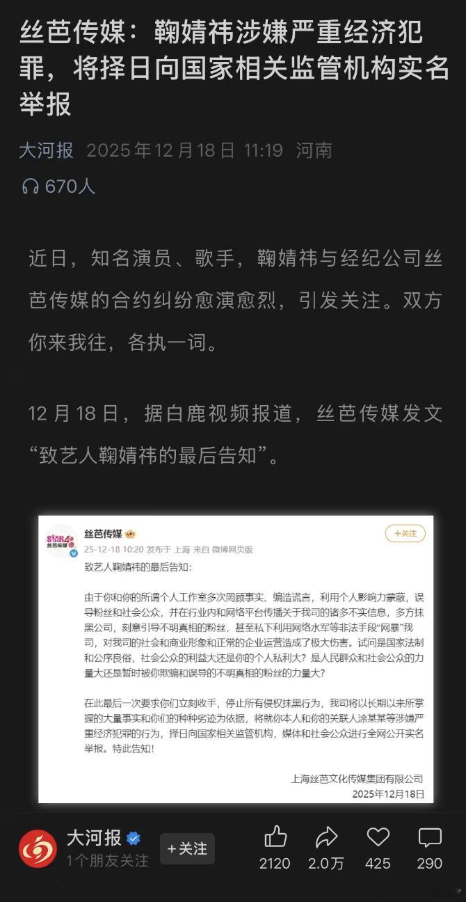 我了个豆,丝芭传媒:鞠婧祎涉嫌严重经济犯罪,将择日向国家相关监管机构实名举报 这瓜越吃越大了,但我感觉在最开始公布收入的时候,就已经想过从纳税的角度再出招。我觉得鞠婧祎要尽快跟律师沟通清楚。 不是网上跟粉丝打打嘴炮的事儿丝芭指控鞠婧祎严重经济犯罪