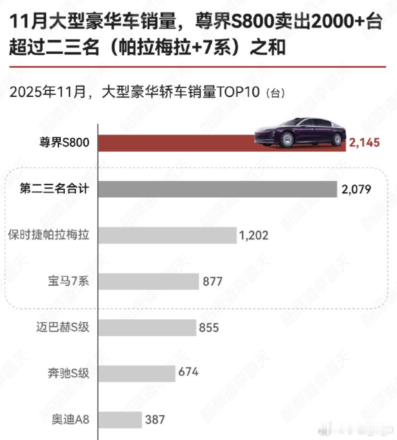 看到的图,尊界S800 11月销量超帕美跟宝马7之和,我觉得这真的很不容易。一方面是尊界S800的成功,另一方面,我觉得也是新能源渗透来到60%后,在全价格维度对燃油车的一种胜利,从A0级到D级,都有现象级的新能源产品存在。尊界s800尊界鸿蒙智行