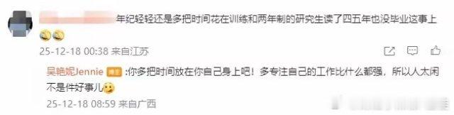 吴艳妮发布9宫格写真引网友嘲讽,本人回怼12月17日,中国田径名将吴艳妮发布一则9宫格写真,引网友关注。有网友在其底下评论让吴艳妮多把时间花在训练和两年制研究生读了四五年也没毕业这件事上。12月18日,吴艳妮回复该条评论,称“你多把时间放在你自己身上吧,多专注自己的工作比什么都强,所以人太闲不是件好事儿”。相关报道11月19日,全运会女子100米栏决赛中,吴艳妮摘得银牌后泪洒颁奖台,引发争议。12月10日,据澎湃新闻报道,吴艳妮接受专访时表示,“(有人)就会觉得我小家子气,别人拿冠军然后你哭,我哭咋了,你今天就是被老板裁员,你不难受吗?人都是有情绪的生物。”此外,吴艳妮还回应了被“黑”:“我会去看评论,但我不会因为评论而哭。我只是在生活当中给他们(提供)情绪价值的那个人。”“我觉得很不解的一点是,你们每天真的那么闲吗?”被问及接下来的计划,她表示:“接下来就是休息,我太累了。”来源:中国蓝新闻、澎湃新闻