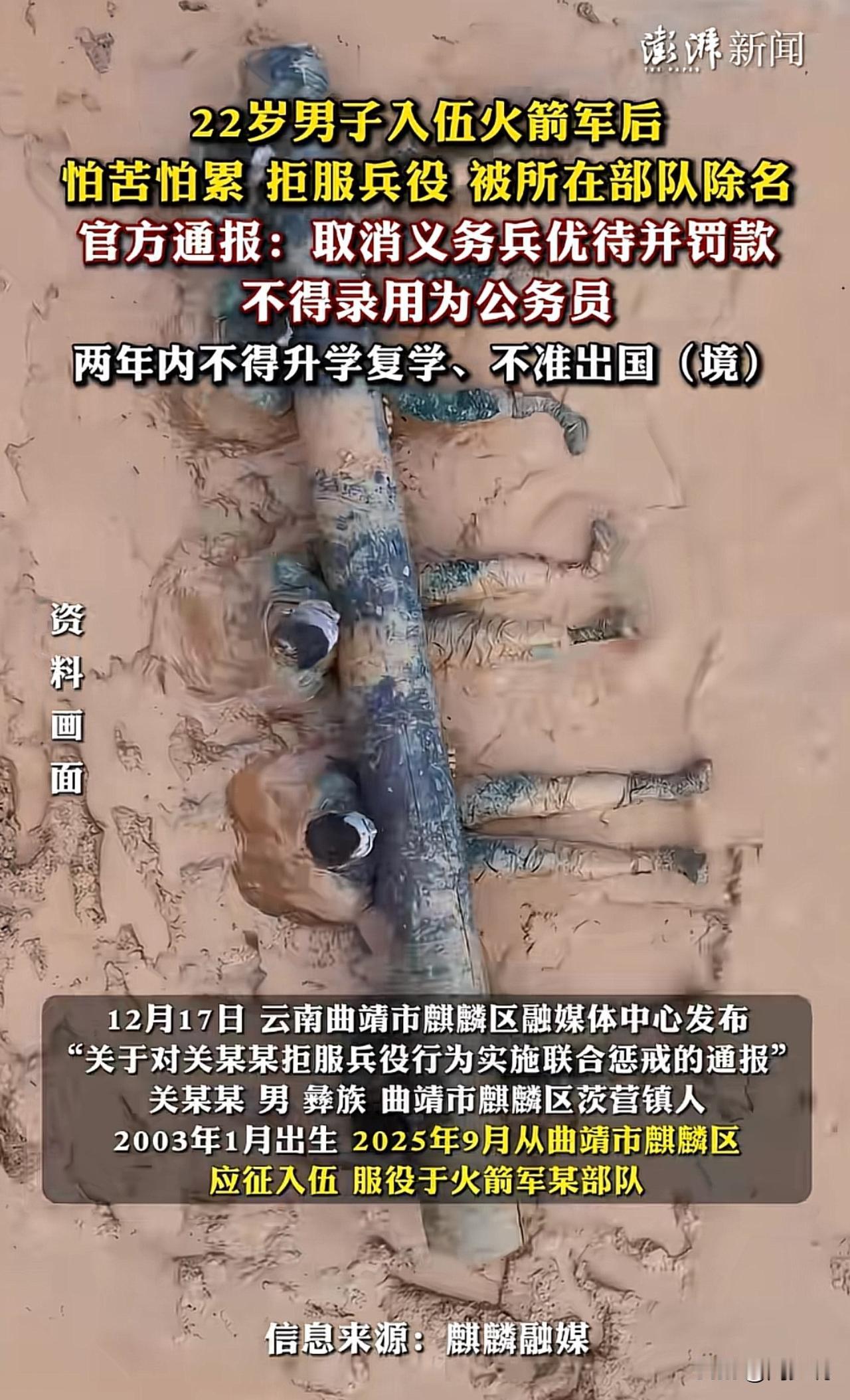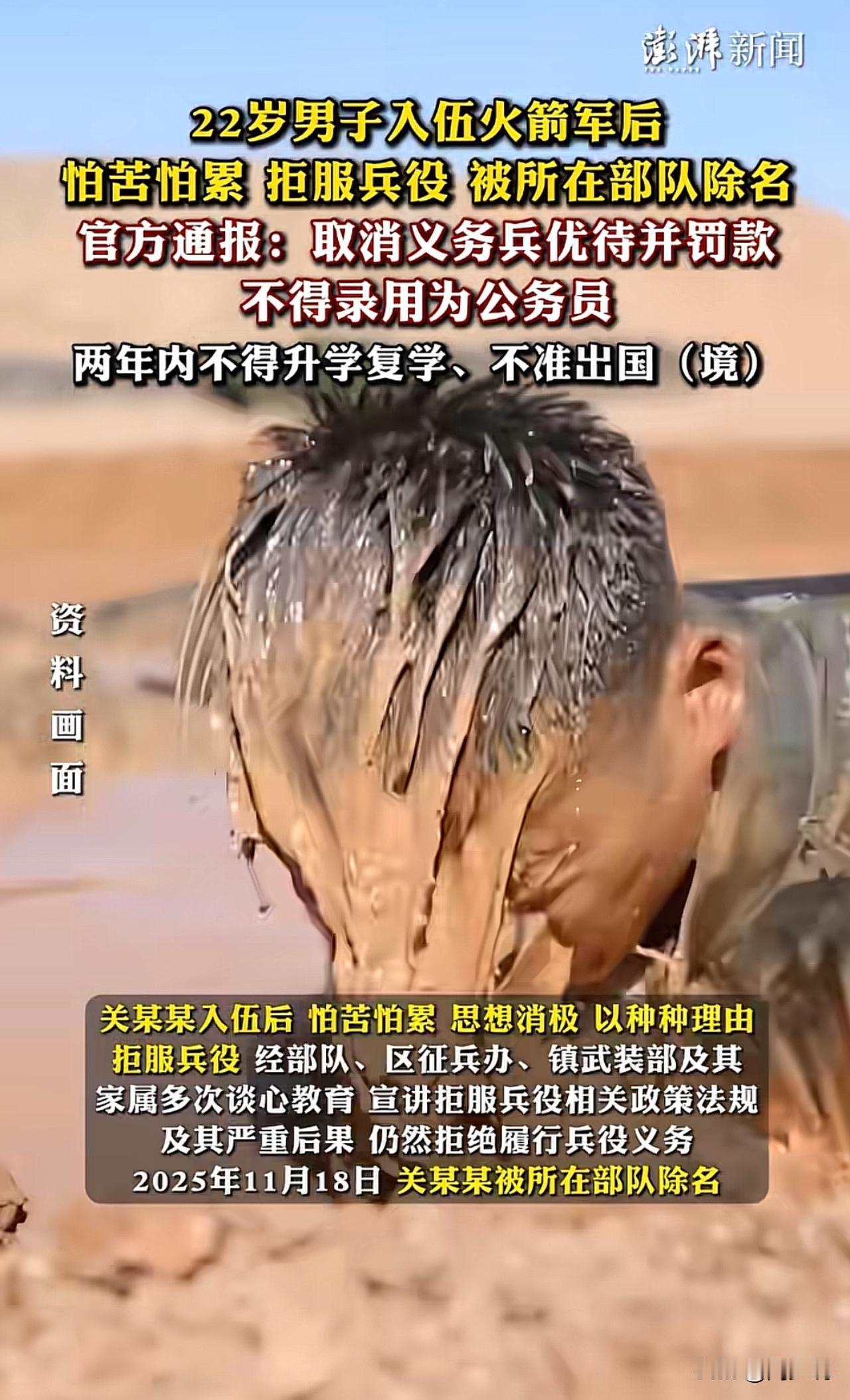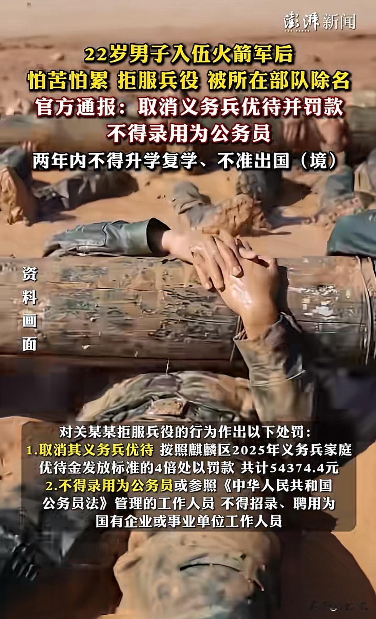 丢人!22岁男子入伍火箭军后拒服兵役,官方随后通报,不仅取消他的义务兵相关优待、处以罚款,还明确其两年内不得升学复学、不准出国(境),终身不得被录用为公务员。 参军入伍不仅是义务,更是锤炼意志、担当责任的成长契机。怕苦怕累选择退缩,丢掉的不只是军旅荣光,更是宝贵的品质历练。被通报处罚,也是咎由自取。 除此之外,这起事件,周少认为更是一堂深刻的教育课:人生没有“逃避”的捷径,既然选择了参军入伍,那就要迎难而上,扛起相应的责任,才能真正撑起自己的未来。#寻美三湘# #长沙新朋友#