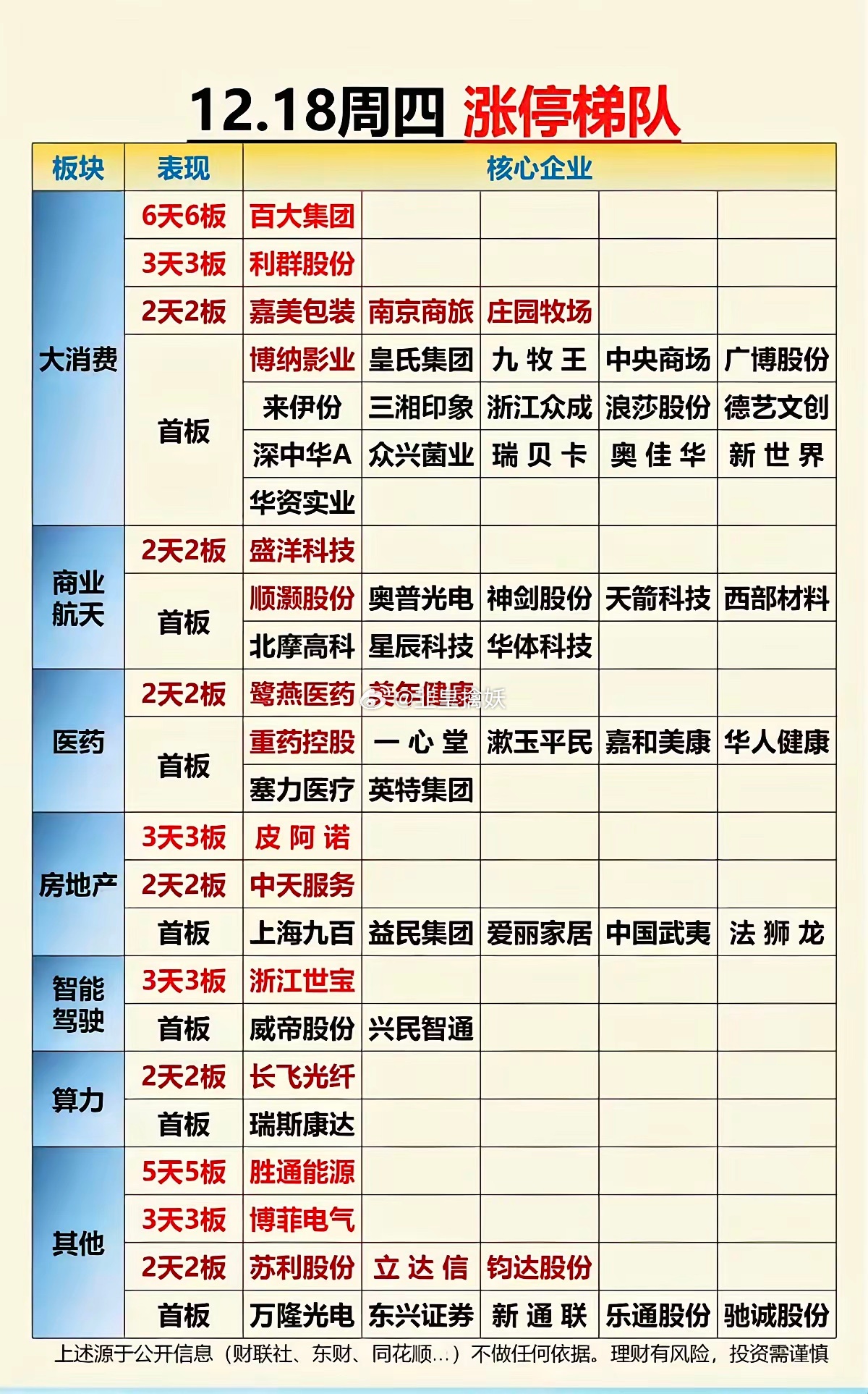 12.18周四 涨停板股票:题材+高度!1.大消费 21股涨停2.商业航天 9股涨停3.医药 9股涨停4.房地产 7股涨停5.无人驾驶 3股涨停