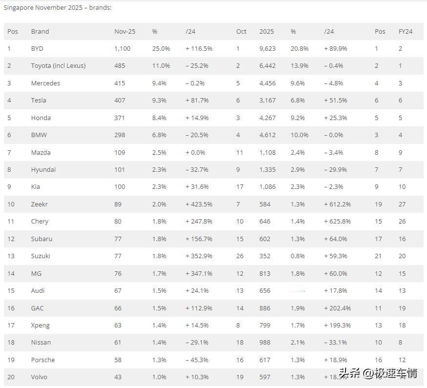11月,新加坡车市,中国品牌销量详情! 大家好,这里是极速车情。今天为大家带来新加坡汽车市场11月份的销量数据报告。 11月,新加坡车市呈现 "中国品牌主导、传统品牌承压" 的格局,比亚迪凭借全产品线的强势表现继续扩大领先优势,而丰田等传统豪强则面临市场份额的持续流失。随着更多中国品牌进入和产品线扩充,预计这一趋势将在未来数月持续,中国品牌有望进一步巩固其在新加坡车市的主导地位。 2025年11月,新加坡新车销量同比激增21.9%,至4,395辆。 2025年1-11月,新加坡累计销量同比增长23.2%,至46,288辆。 中国品牌表现:中国品牌整体市场份额已达50% 以上,远超去年同期。 比亚迪:1100辆,高居第一,连续十月领跑,市占率25%。 极氪:89辆,排名第十,市占率2%。 奇瑞:80辆,市占率1.8%。 名爵:76辆,市占率1.7%。 广汽:66辆,市占率1.5%。 小鹏:63辆,市占率1.4%。 东风:39辆。 阿维塔:18辆。 吉利:16辆。 大通:16辆。 零跑:13辆。 深蓝:5辆。 长城:3辆。