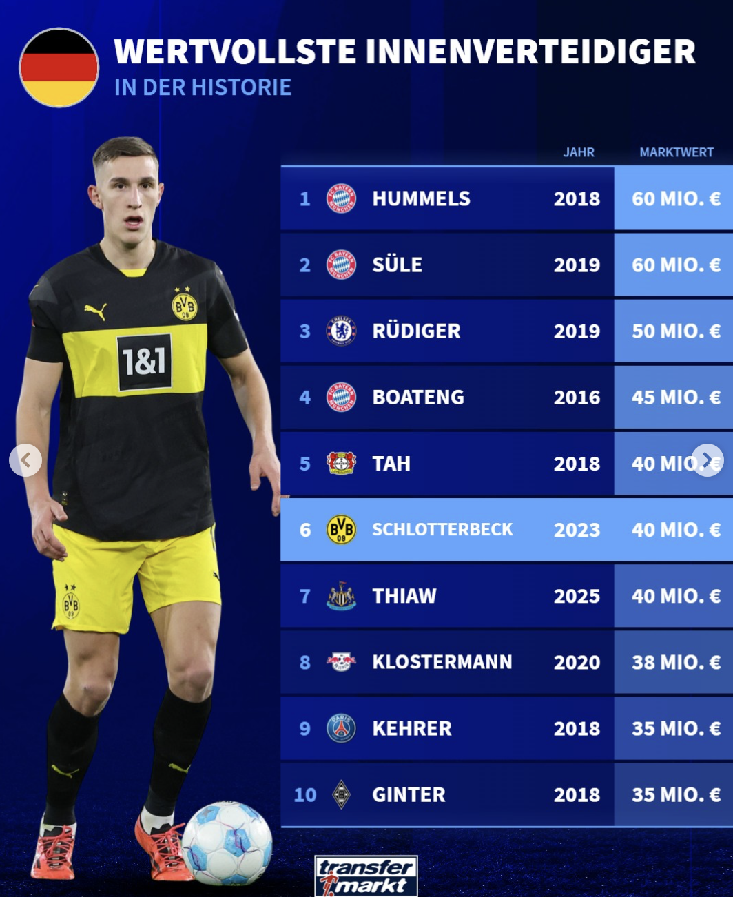 虎扑12月18日讯德转将于12月19日更新德甲球员的身价。在此之前,德转盘点了德国中卫历史身价榜。