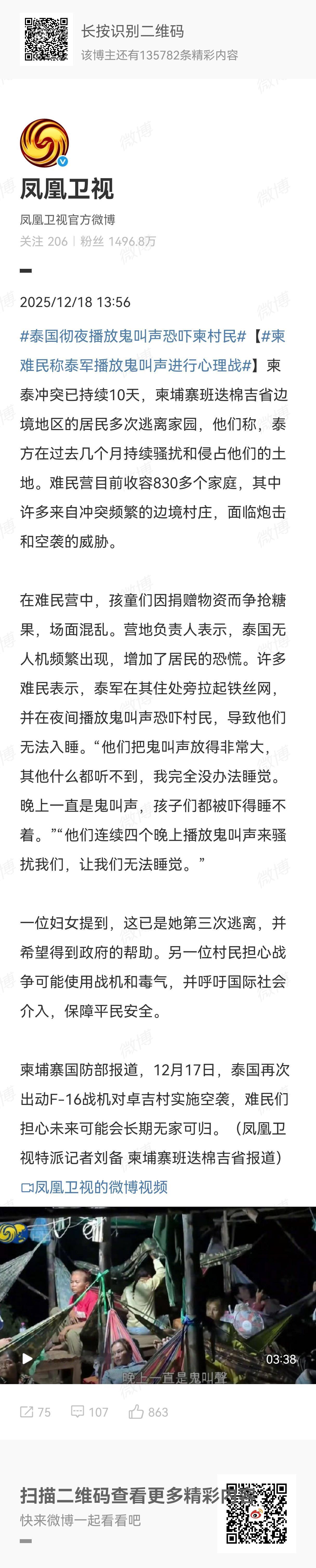 据凤凰卫视报道:柬埔寨班迭棉吉省边境地区的难民们称,泰方在过去几个月持续骚扰和侵占他们的土地。难民营目前收容830多个家庭,其中许多来自冲突频繁的边境村庄,面临炮击和空袭的威胁。一看这描述的情景,真的有点泰国。 不知道大家看过泰国的广告没有,他们的广告比我们好多短剧还有意思,简直是一部情景剧,首先是场景很恐怖,然后剧情反转再反转,一个广告起码五六分钟。我看过他们的蟑螂药广告,情节很曲折也很恐怖。 女主人回到家,首先映入眼帘的是男主人装备的蟑螂,男主人已经被蟑螂吃掉了。女主人和蟑螂斗智斗勇,因为她如果不斗争就会被蟑螂吃掉。经过一番斗争,女主人终于把蟑螂药喷在蟑螂身上,蟑螂开始死了等会又复活了,再过一会儿又死了,然后跳出来一群蟑螂把老蟑螂分尸吃掉了,最后是一群蟑螂都死了。