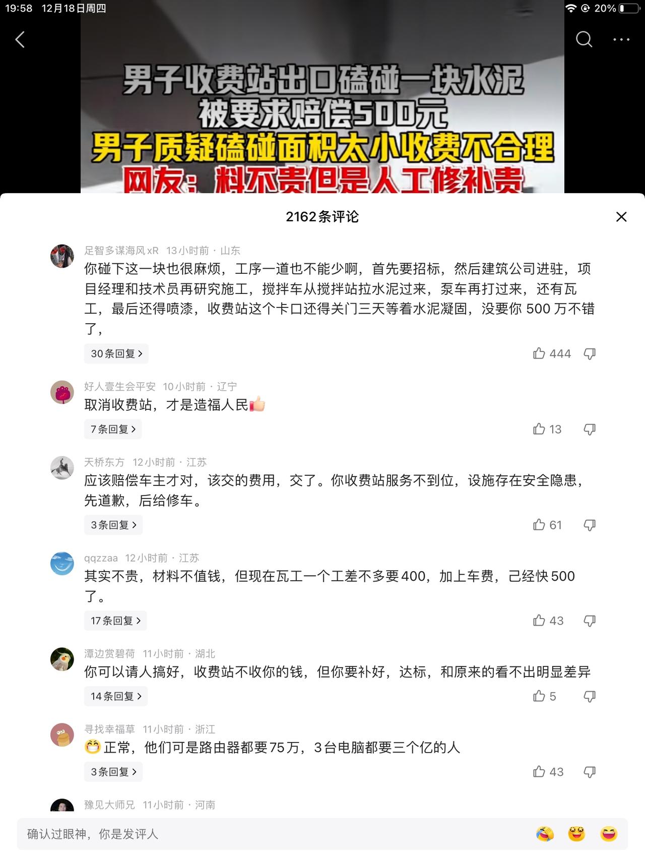 男子收费站路口碰掉一块大拇指头肚两个大小的水泥块,赔偿500块钱。男子嫌弃贵。这你咋说呢,公共设施,损坏了是要赔偿的。你就说贵吧!你是咋开车的,路都那么宽敞,你咋开路标上了呢! 是五百,也不是五千五万,是你自己不长眼,你就吐槽一下就得了。总不能一分钱不要,放你走吧!对吧!…连工带料的,现在请个人也不容易,年轻人没有干的。老年人不一定会开车,里外是个难题。 以后,不想钱受罪,行车还是仔细点。