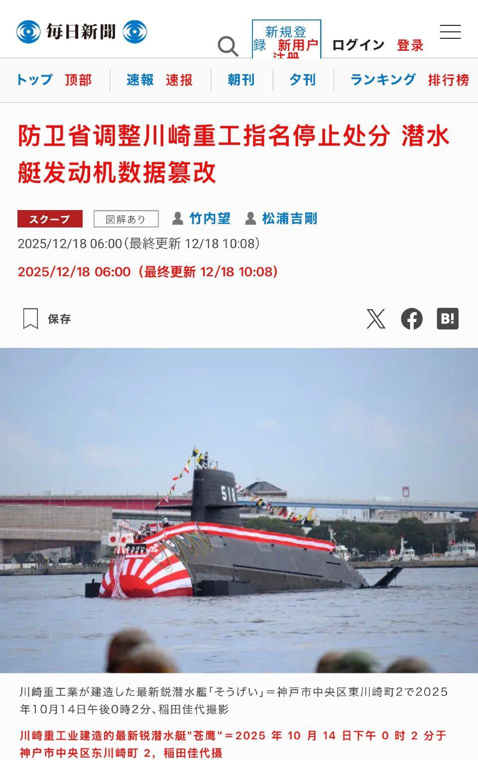 日本防卫省最近对川崎重工开出了罚单。这家军工巨头被爆出,从2002年就开始伪造卖给海上自卫队的潜艇发动机数据,造假时间跨度超过了二十年。 问题发动机被用在了日本海上自卫队几乎所有的现役潜艇上,总共涉及25艘。无论是“亲潮”级、“苍龙”级还是最新的“大鲸”级,甚至是由竞争对手三菱重工建造的潜艇,用的也都是川崎的发动机。 防卫省给出的处罚是,暂停川崎重工两个半月的政府项目投标资格,同时追缴违约金并要求赔偿。官方声称造假“不影响潜艇性能”,但这个相对轻微的处罚,引发了舆论的广泛质疑。 更令人担忧的是,这似乎不是孤立事件。川崎重工有着长期的造假“传统”。此前就被曝光,从1984年开始通过虚假交易设立“小金库”,用来向海上自卫队官员行贿。它的子公司也被揭发存在持续数十年的质检造假行为。 这一连串丑闻,暴露了日本军工行业深层的系统性弊病。从松下到丰田,近年不少日本大企业都出现过长期造假问题,反映出一种扭曲的企业文化。当这种风气蔓延到关乎国家安全的军工领域,其风险是显而易见的。 潜艇发动机数据不实,可能会直接影响其水下续航力和隐蔽性。而焊接工艺等更基础的造假,甚至可能引发结构安全问题。这不仅让日本民众对“日本制造”的信心大打折扣,也让盟友对日本装备的可靠性打上问号。 事件背后,是政企勾结与监管的全面失效。企业通过贿赂维系订单,监管部门则睁一只眼闭一只眼。这场持续数十年的骗局,最终以川崎重工股价暴跌、声誉扫地为代价,也给日本的国防安全埋下了深深的隐患。