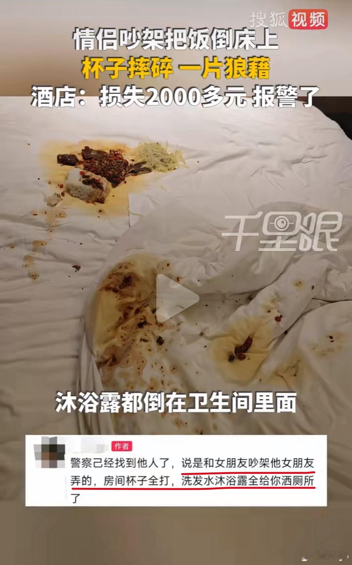 情侣住酒店把饭菜倒床上摔杯跑路店家说:己经找到他人了,说是和女朋友吵架他女朋友弄的,房间杯子全打,洗发水沐浴露全给你酒厕所了。。。。唉,找个情绪稳定的对象是多么重要。