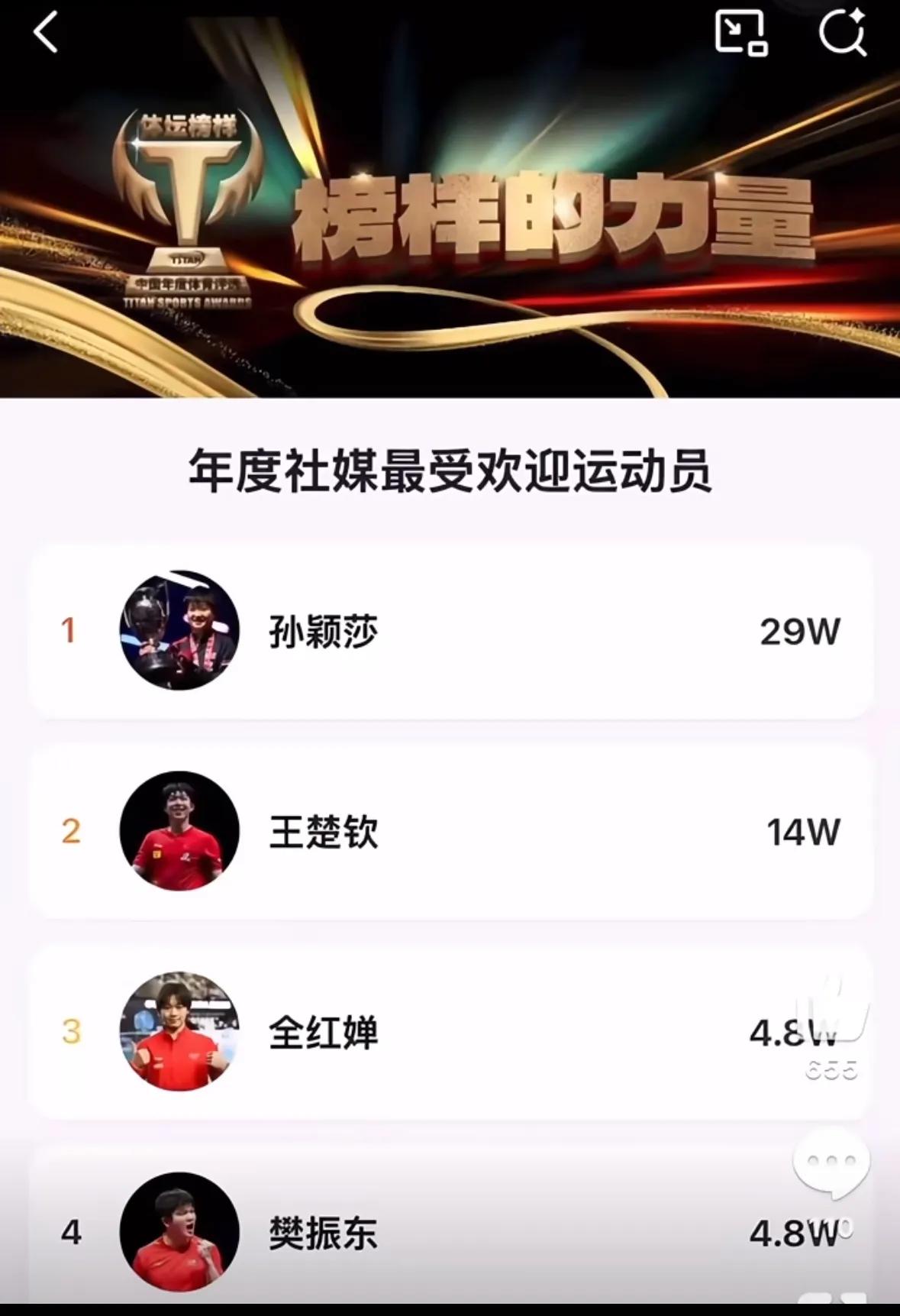 WTT香港总决赛的奖金,单打和混双差距太大了,单打冠军奖金8万美金,混双1万4千美金还是两个人分。 单打16强的奖金1万4千美金,混双冠军不如单打一轮游,而且混双还打循环小组赛,多打好几场,多受很多辛苦压力。 赛后举办方又给冠军增加了奖金,打混双的莎头组合,栋曼组合亏大了。 国际乒联主席索林女士,WTT首席执行官丹顿先生,和香港举办方都表示,香港总决赛是最成功最好的一次,难道这不是中国队员,特别是王楚钦,孙颖莎,他们带来的成果吗?门票的收入和带动旅游住宿的消费收入。 看看孙颖莎,王楚钦,他们的热度吧,排名第一孙颖莎,第二的王楚钦,第三是跳水的全红婵,第4是樊振东,但是樊振东没参加总决赛,香港总决赛的主要贡献来自孙颖莎,王楚钦,他们兼项受伤退赛,比赛结束后,WTT的管理者,国际乒联的领导,香港总决赛举办方,有过对王楚钦,孙颖莎受伤关心过吗?有过感谢的话吗?真是让人寒心,用力的用,不情的甩,只有中国乒协做出了回应,要保障队员受伤康复的机制。以后王楚钦,孙颖莎对不合理该拒绝就拒绝,该退赛就退赛。
