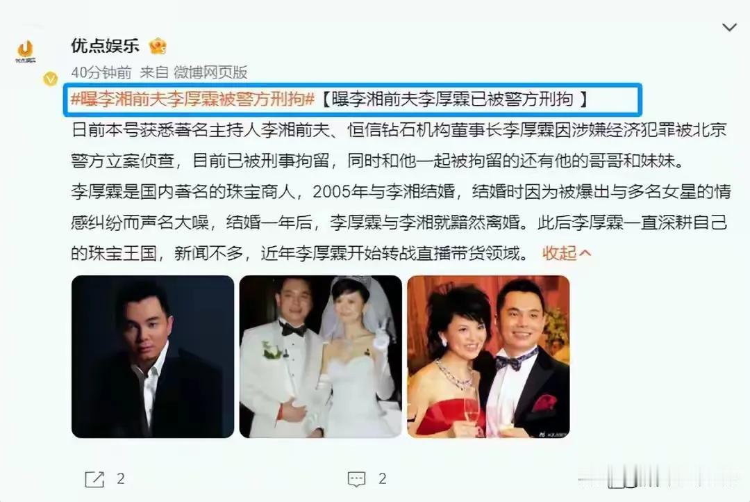 网上曝出,李湘的前夫李厚霖突然被刑拘,还包括李厚霖的哥哥和妹妹。记得几个月前,李厚霖还出现在公众平台直播卖货,说要依靠带货来还债务,看来是还不上了,才出现如此境地。 李厚霖原本是和秦海璐谈恋爱,分手之后李湘嫁给了他。 没结婚两年又离了婚。 李厚林也是做过好事的,也传播过正能量,他成立的基金挽救了许多人。 只是他和李亚鹏一样能折腾,爱折腾。